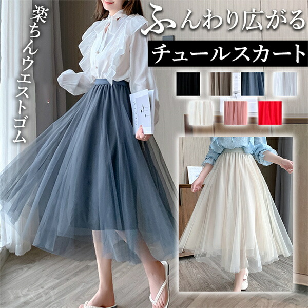 チュールスカート ロングスカート ハイウエスト ウエストゴム ハイウエストスカート レディース お家時間 大人可愛い シンプル 可愛いデイリー 春 夏 秋 リラックスタイム 大人 フリーサイズ ゆったり 太もも 体形カバー お洒落