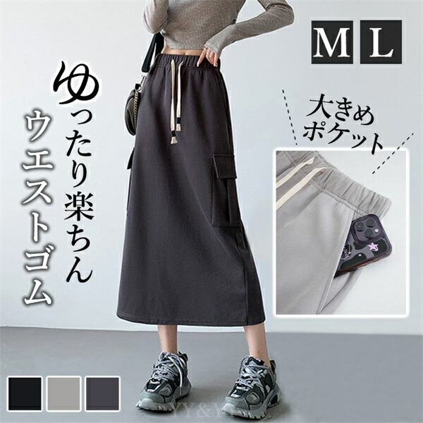 ロングスカート タイトスカート ウエストゴム スウェット 韓国系 ハイウエストスカート レディース シンプル デイリー 春 夏 秋 オールシーズン ゆったり M L 美脚 体型カバー 脚長 華奢見せ ジム通い 大人かわいい ポケット