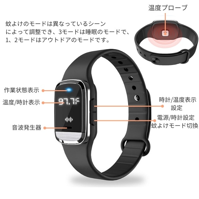 ◆リストバンドの素材はシリコンで、肌にやさしい、刺激がないです。ネックレス式のストラップとしても使えます。待機状態の場合、電源ボタンを押して使用できます。蚊よけのモードは異なっているシーンによって調整でき、3モードは睡眠のモードで、1、2モードはアウトドアのモードです。室外イベントは1、2モードがおすすめです。