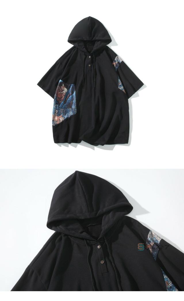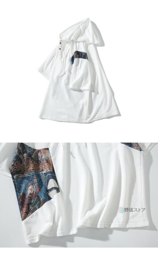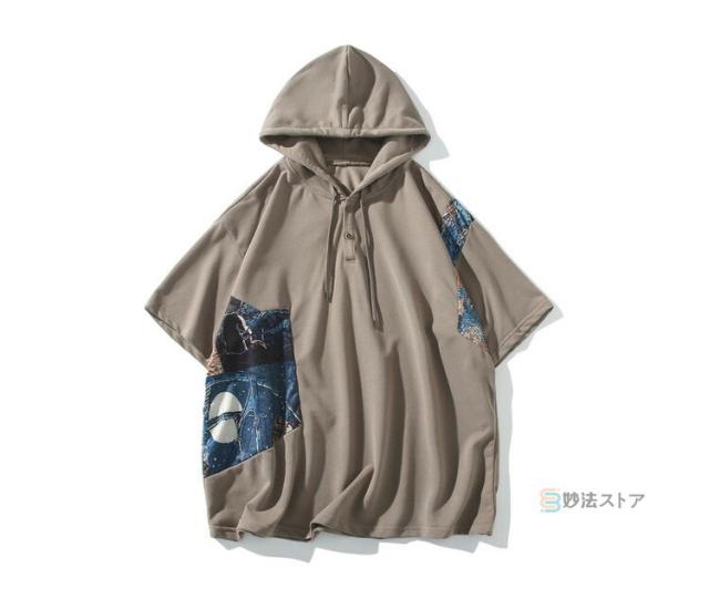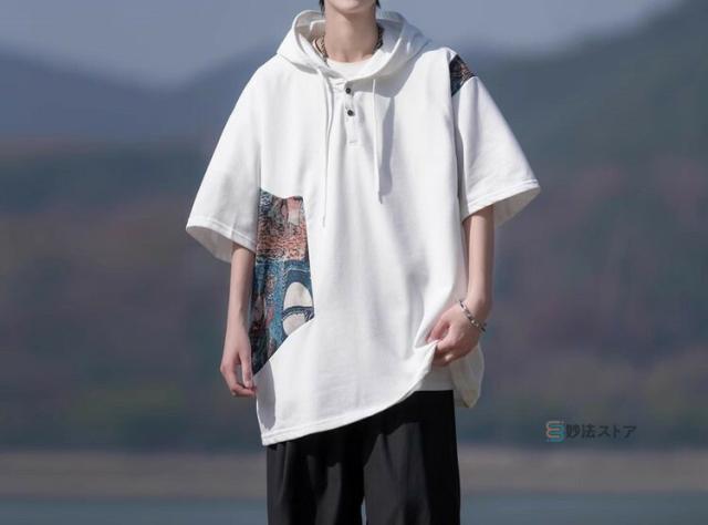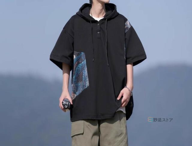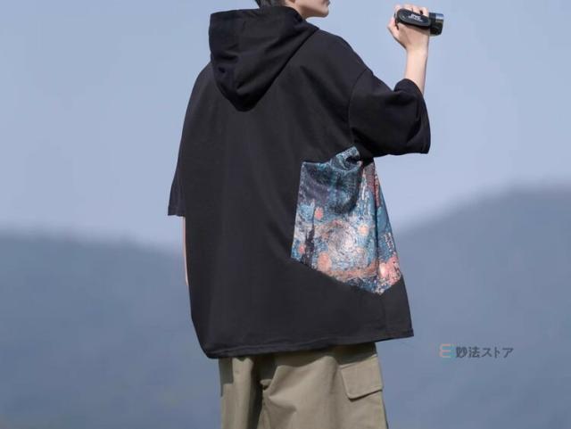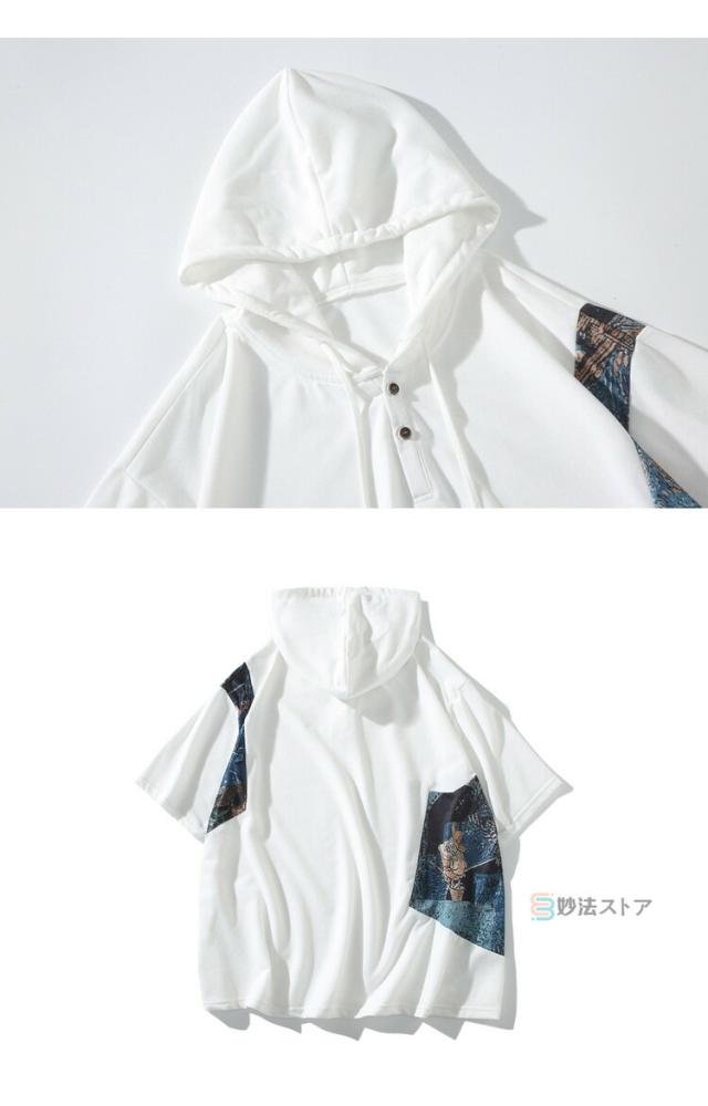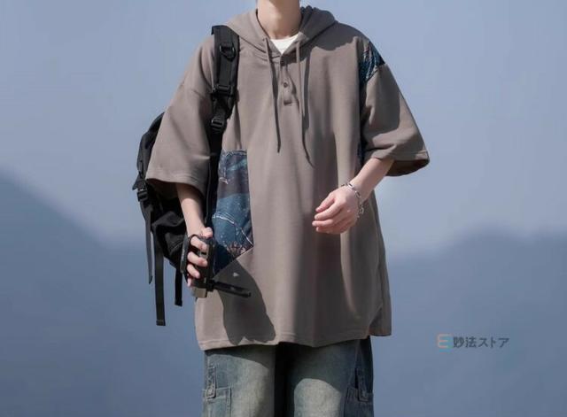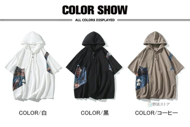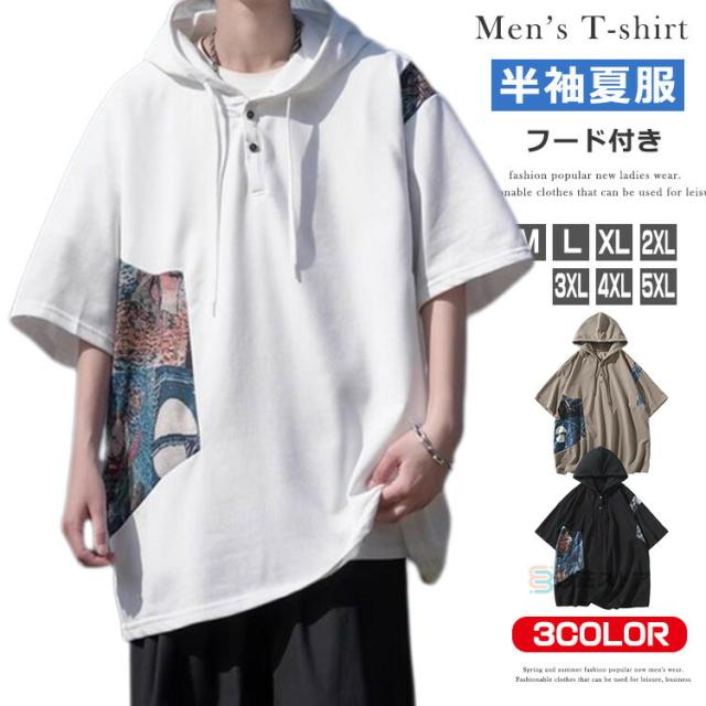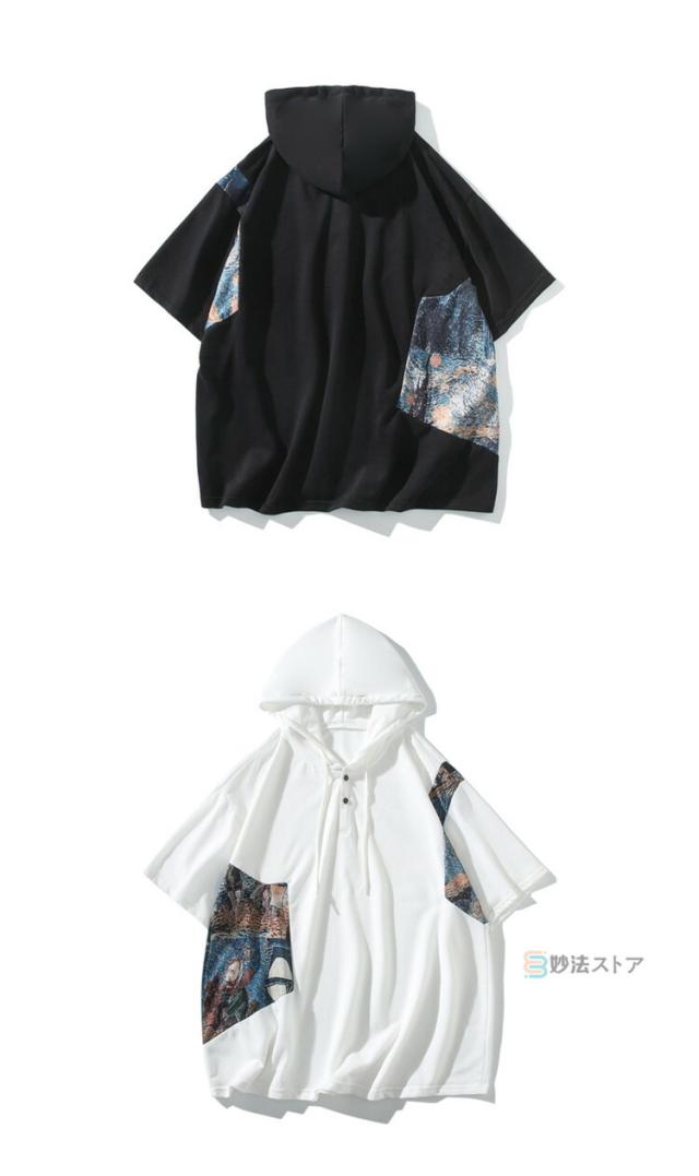 Tシャツ フード付 カットソー メンズ ゆったり tシャツ 半袖 大きいサイズ フード付き パーカー フーディー ティーシャツ カジュアル 薄手 フード付きパーカー 配色 プルオーバー 薄手 夏物