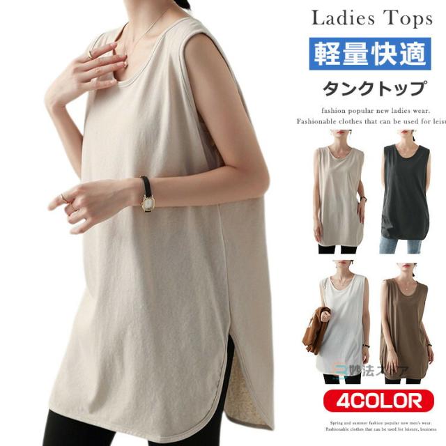 カットソー レディース トップス タンクトップ ロング チュニック ノースリーブ スリット タンク ロングタンクトップ インナー ラウンド裾 Uネック 重ね着 ロング丈 シンプル 無地 春 夏 お尻が隠れる 肌に優しい