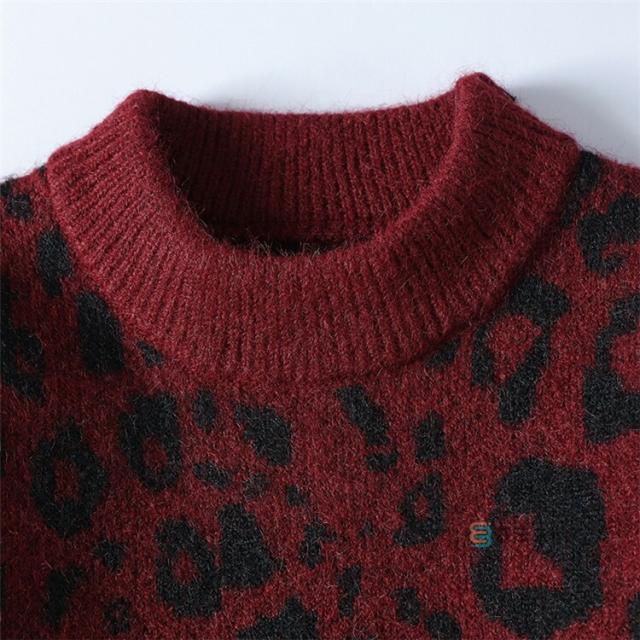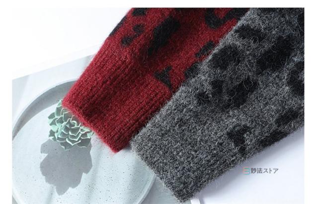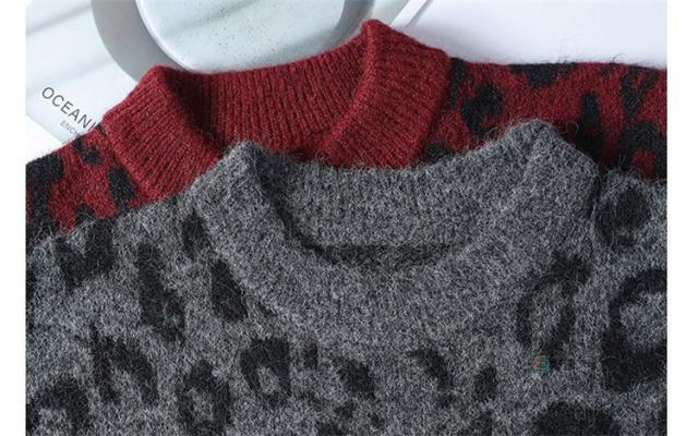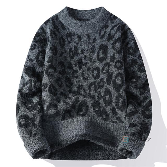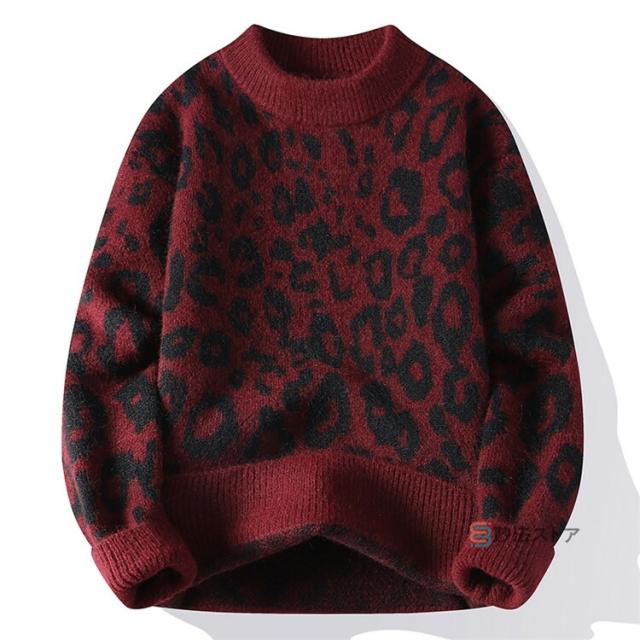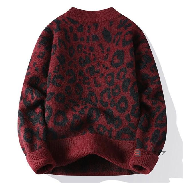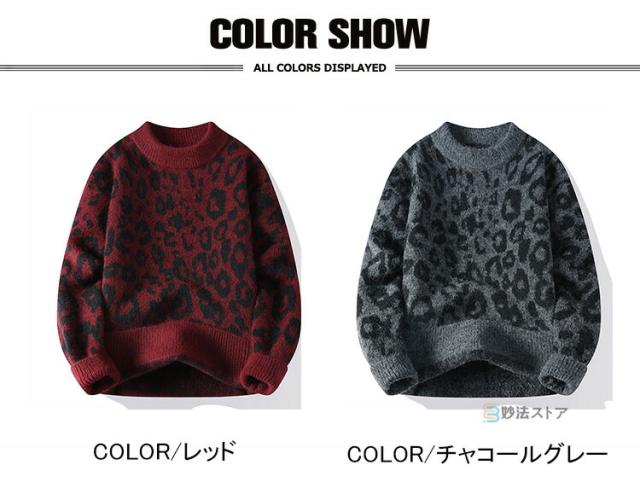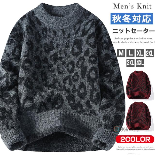 ニット セーター メンズ 長袖 クルーネック ニットセーター ヒョウ柄 レオパード メンズニット リブニット メンズセーター カットソー 厚手 秋服 冬服 おしゃれ リブ編み 暖かい