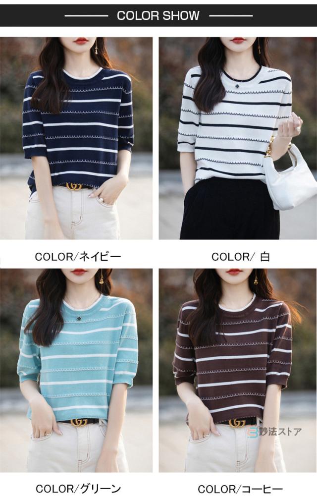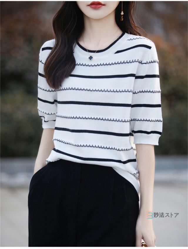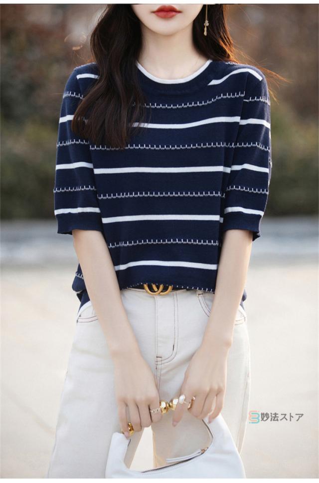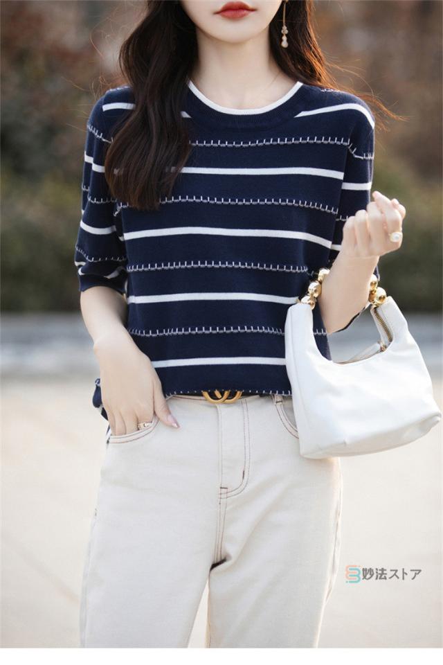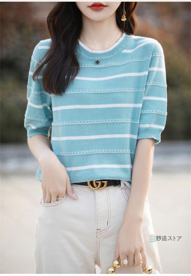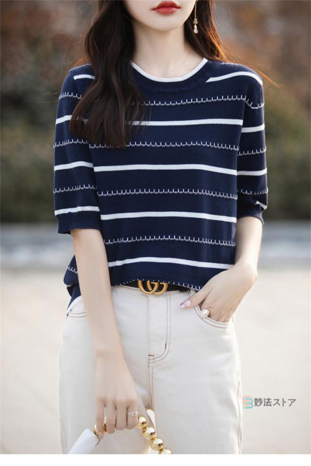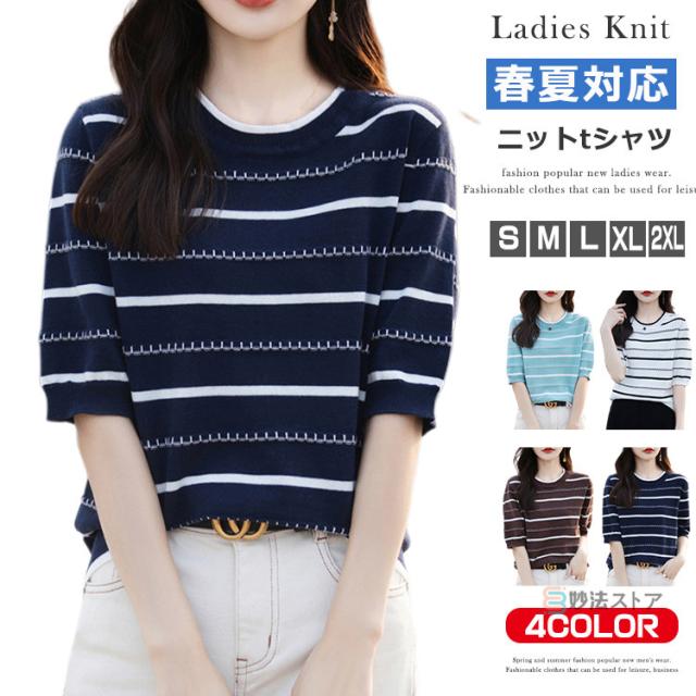 サマーニット 春 夏 ニット レディース トップス 薄手 5分袖 プルオーバー 半袖ニット ボーダー柄 カジュアル ニットトップス ニットtシャツ きれいめ オフィス ママ 母 カットソー 綿ニット コットンニット 女性 大人