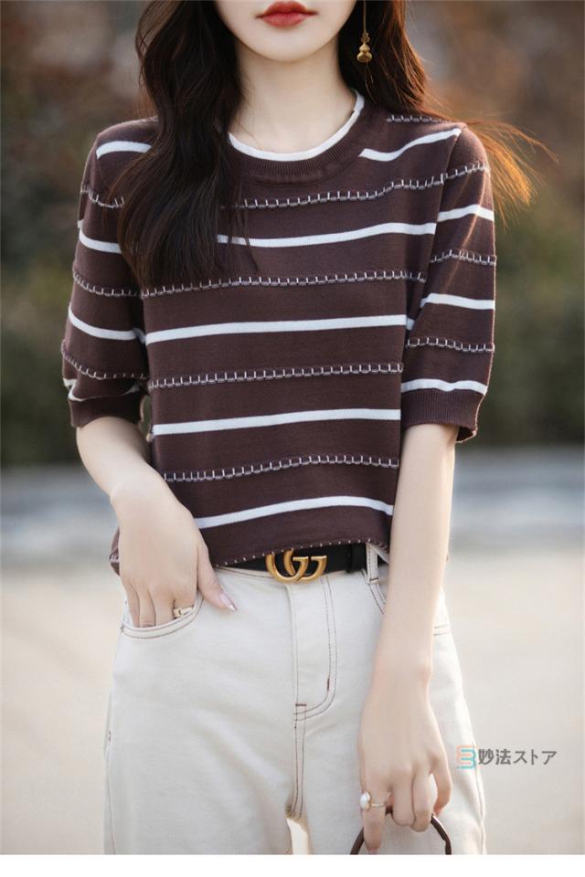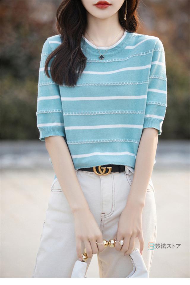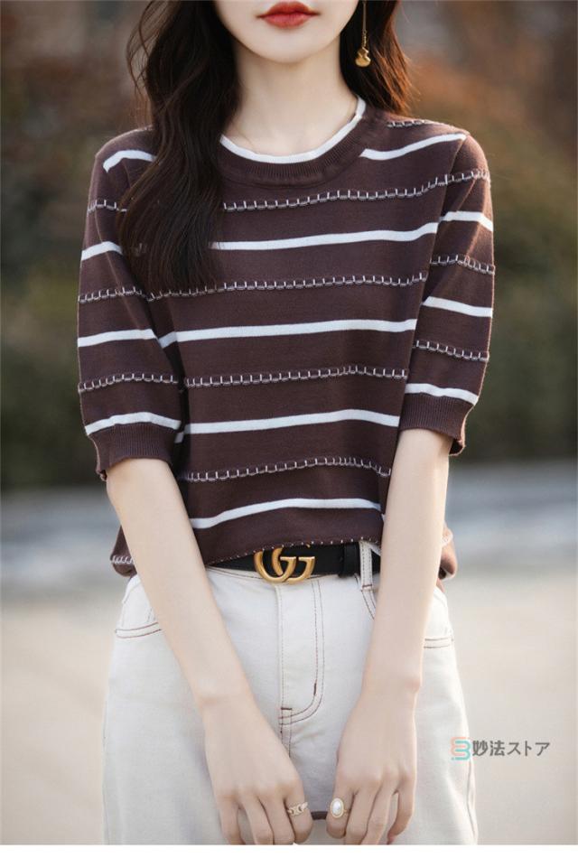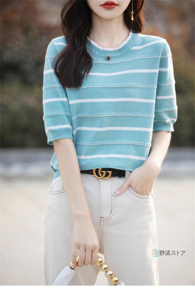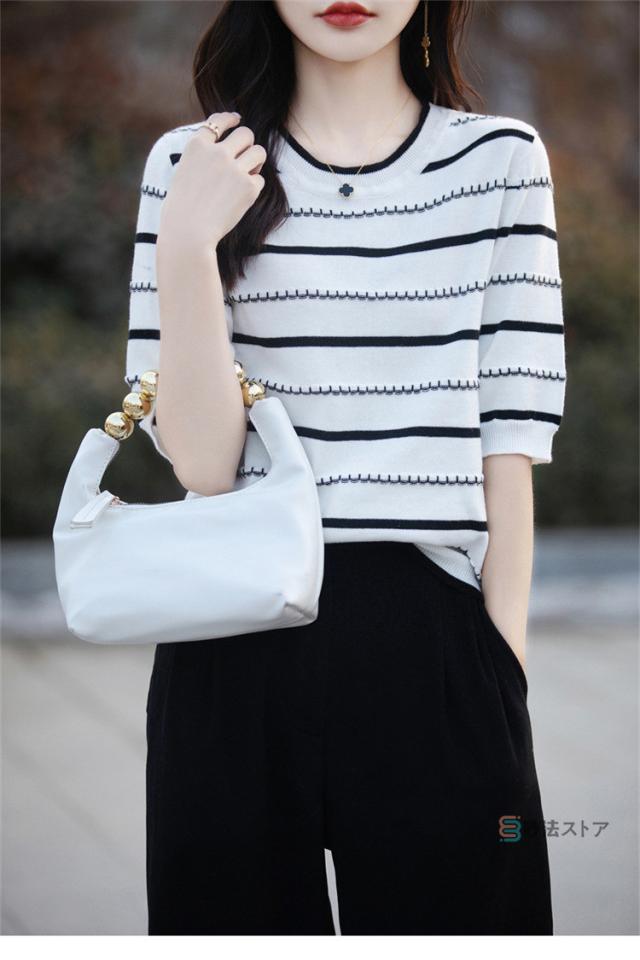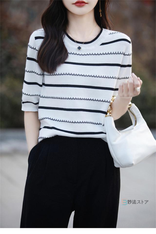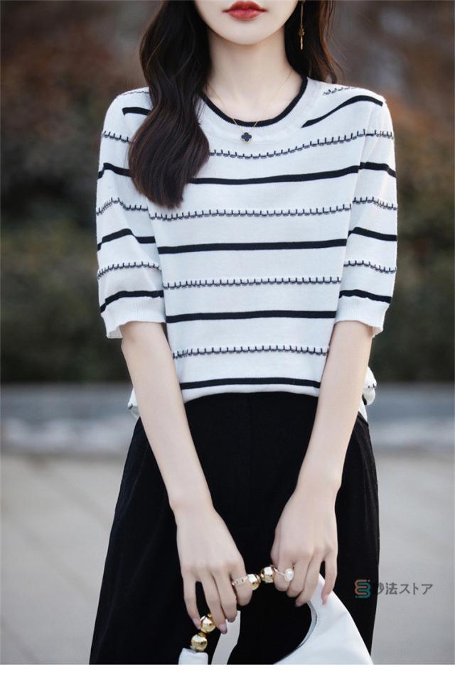 サマーニット 春 夏 ニット レディース トップス 薄手 5分袖 プルオーバー 半袖ニット ボーダー柄 カジュアル ニットトップス ニットtシャツ きれいめ オフィス ママ 母 カットソー 綿ニット コットンニット 女性 大人