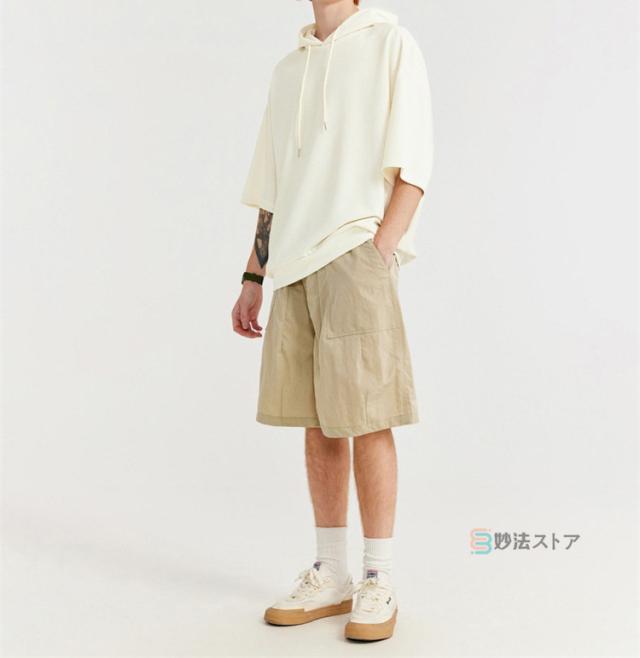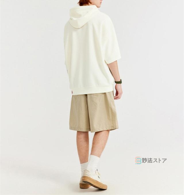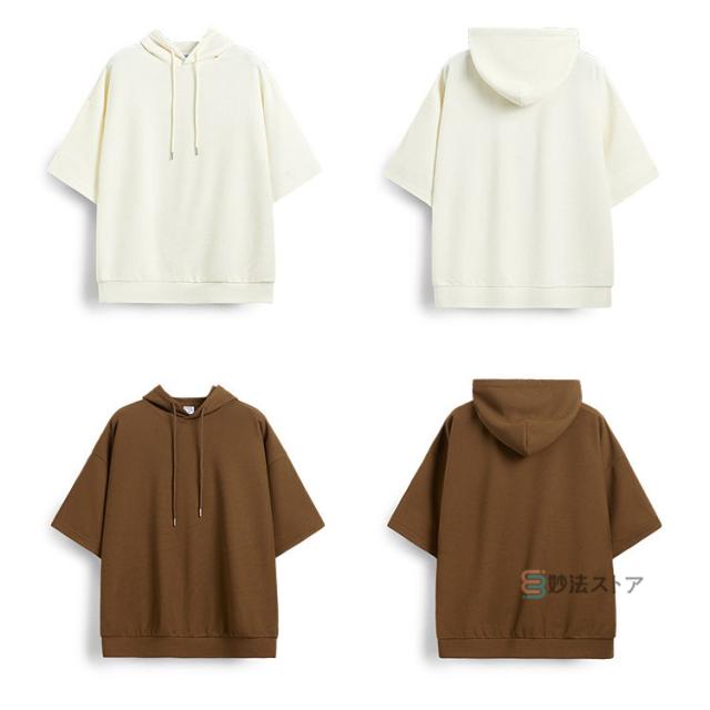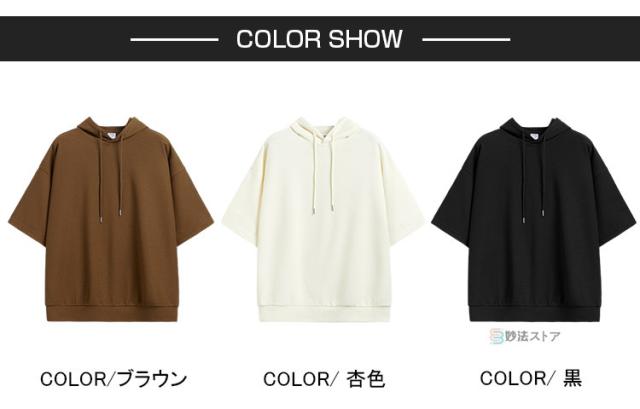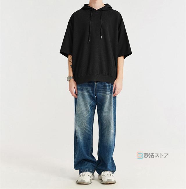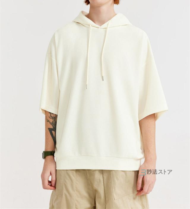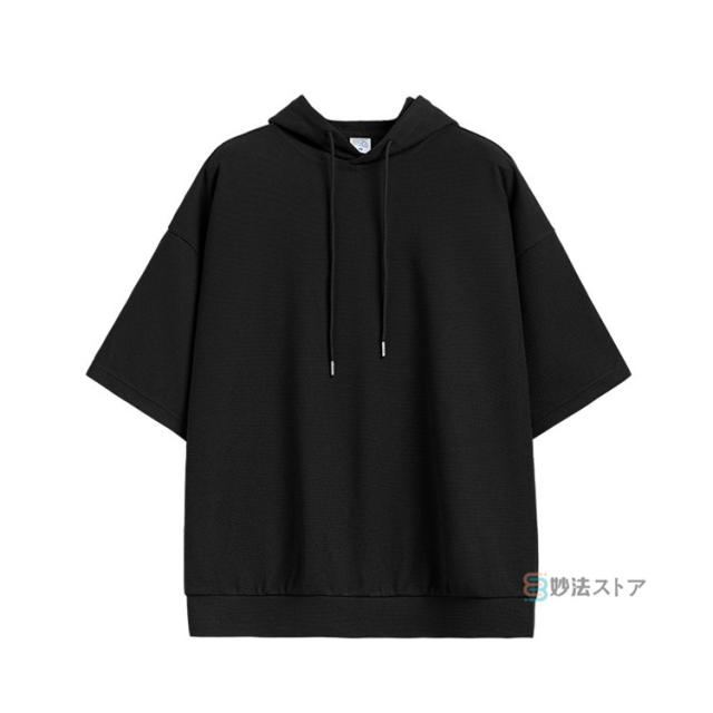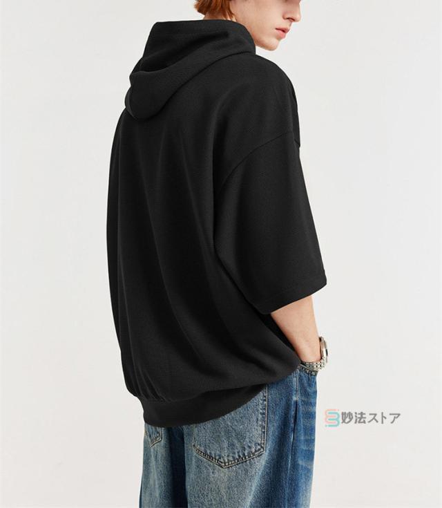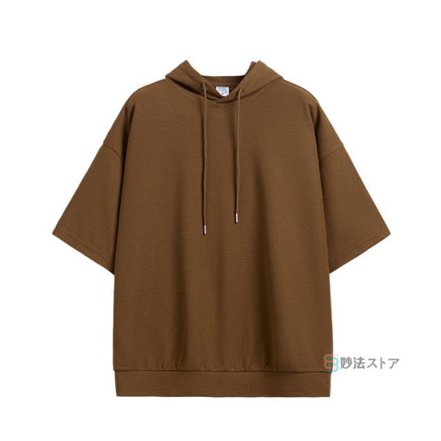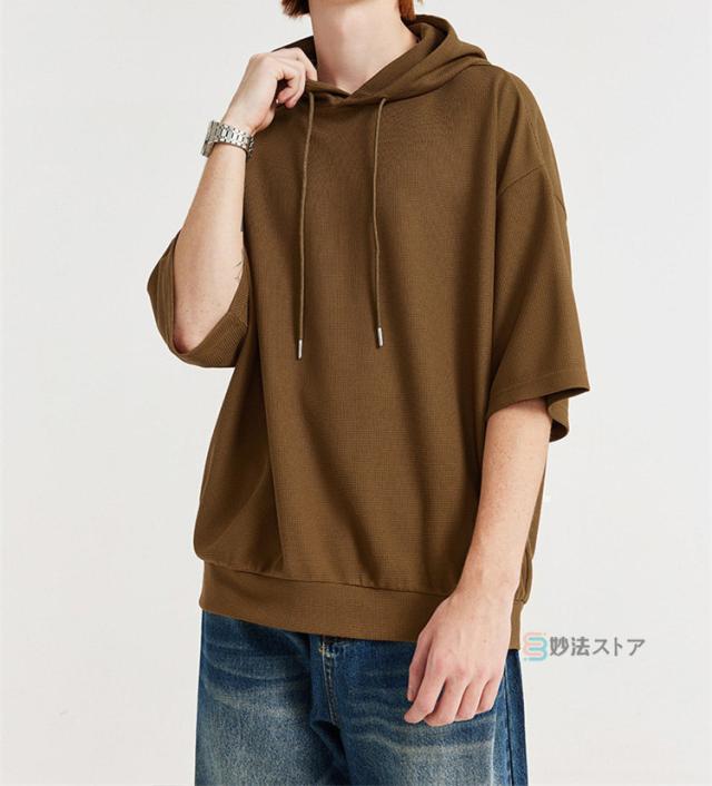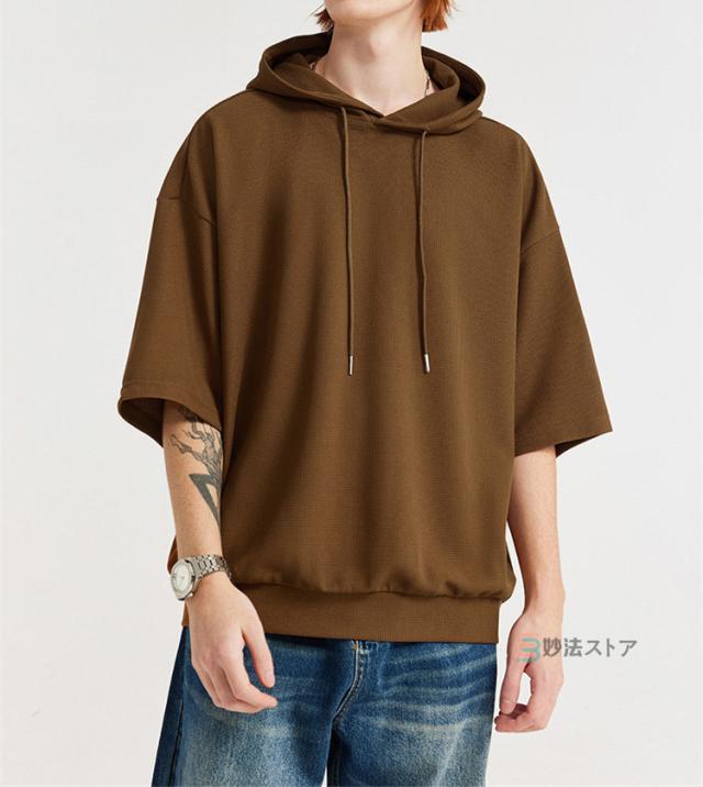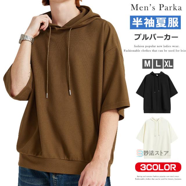 パーカー メンズ 半袖 パーカー ビッグパーカー オーバーサイズ プルパーカー プルオーバー ワッフル 夏パーカー 半袖パーカー ビッグシルエット フード ドロップショルダー 夏服 夏 メンズファッション ブラック ブラウン 杏色