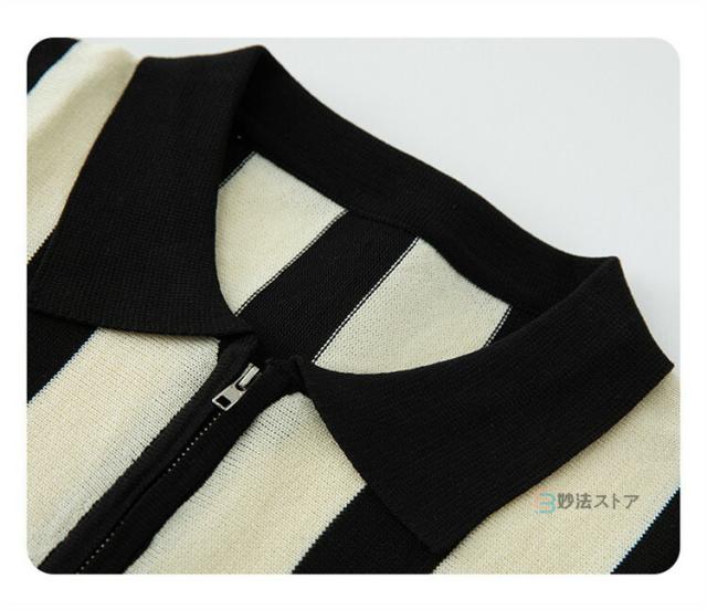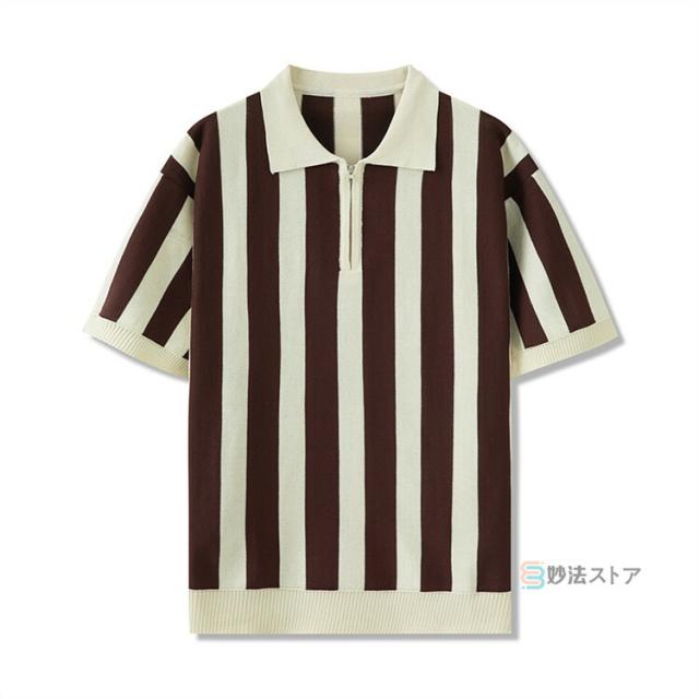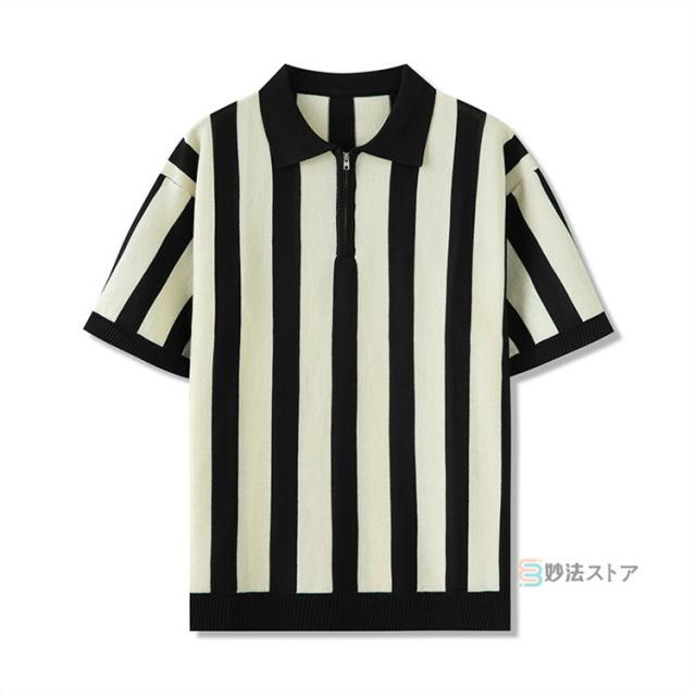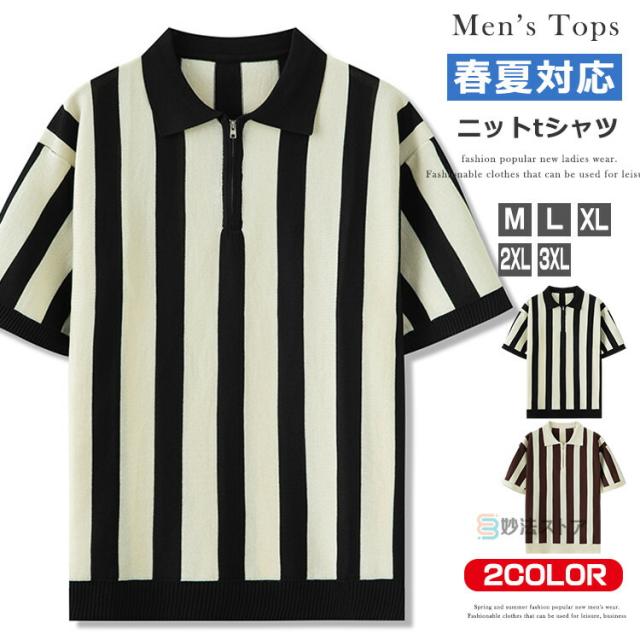 襟付き ニット サマーニット メンズ おしゃれ 大人 ニットポロシャツ 薄手 ニット サマーセーター 半袖ニット ニットTシャツ トップス ハーフジップ ストライプ柄 ゴルフ ゴルフウェア ビジネス カジュアル 仕事 春物 夏 夏服 夏物