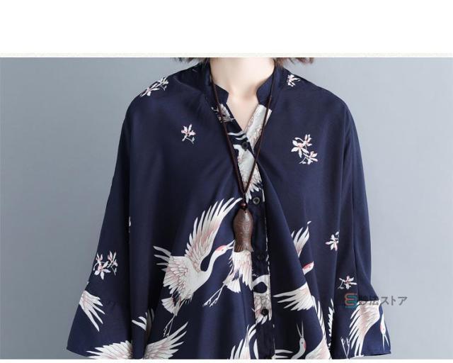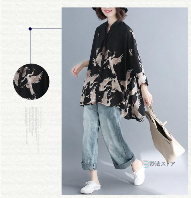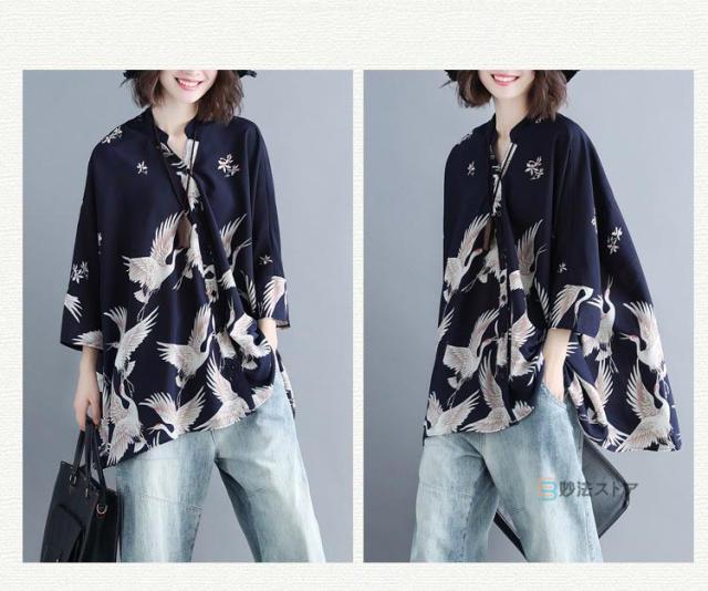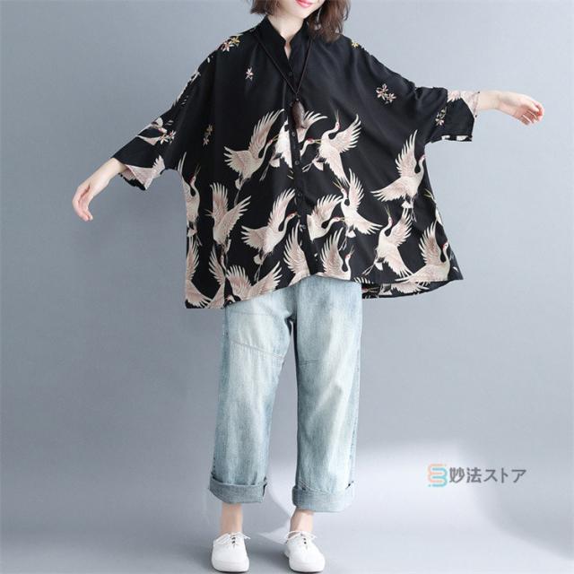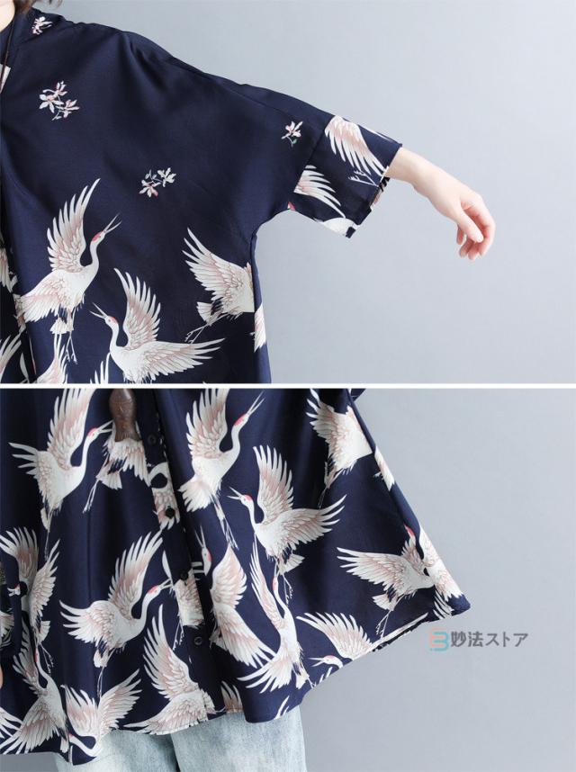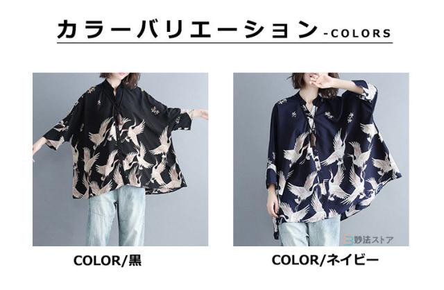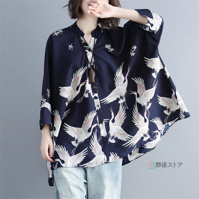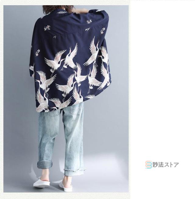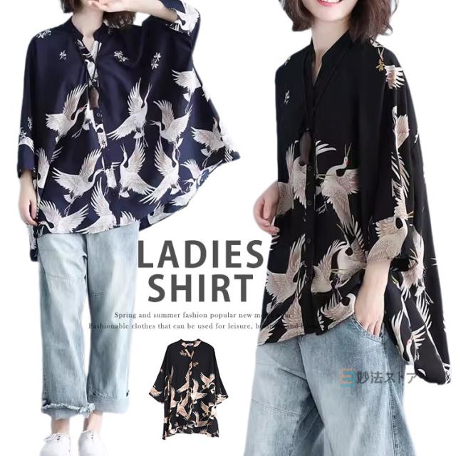 オーバーサイズ シャツ レディース ブラウス 七分袖 アロハシャツ シャツブラウス トップス 柄シャツ 和柄 鶴柄 プルオーバーシャツ 羽織り スキッパーブラウス 体型カバー 7分袖シャツ ビッグシャツ 夏 サマー ネイビー ブラック 送料無料