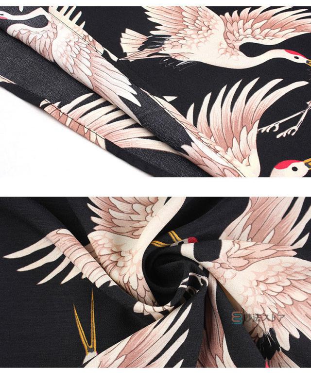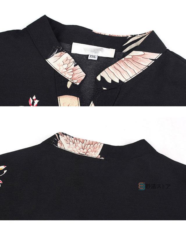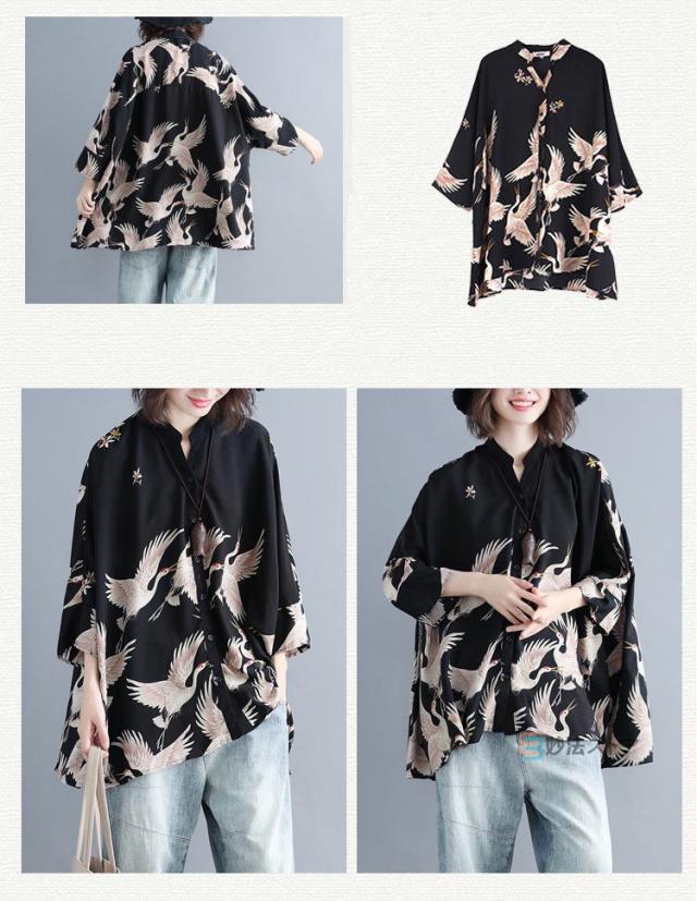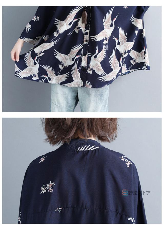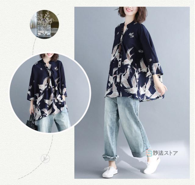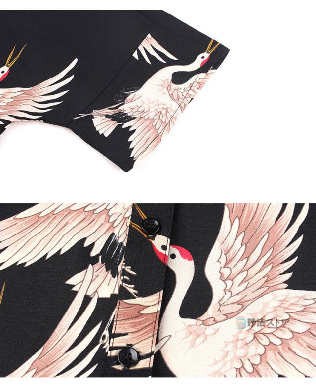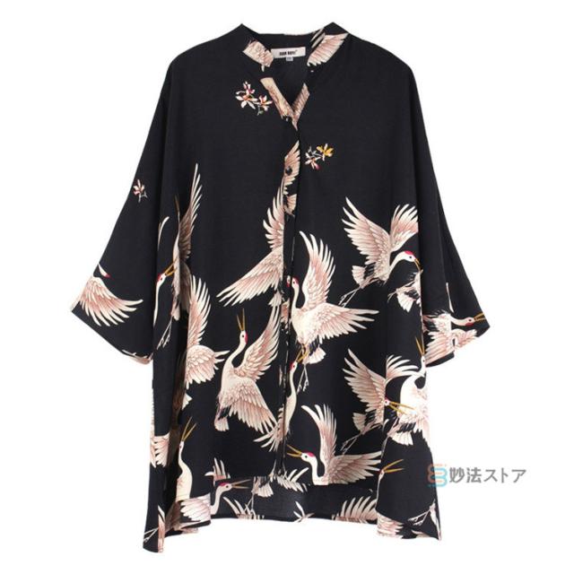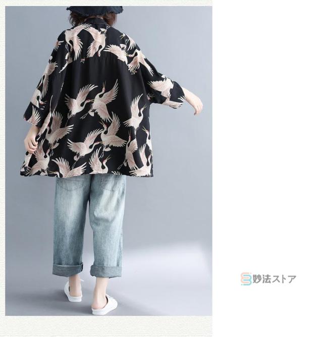 オーバーサイズ シャツ レディース ブラウス 七分袖 アロハシャツ シャツブラウス トップス 柄シャツ 和柄 鶴柄 プルオーバーシャツ 羽織り スキッパーブラウス 体型カバー 7分袖シャツ ビッグシャツ 夏 サマー ネイビー ブラック 送料無料