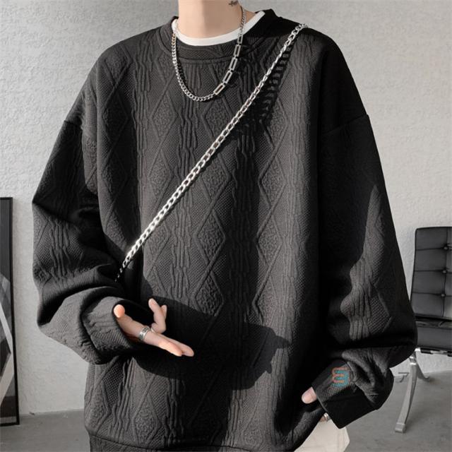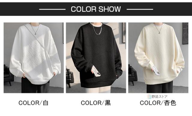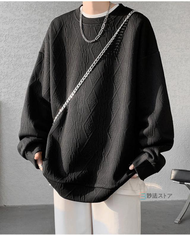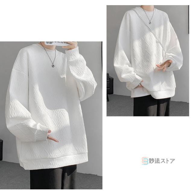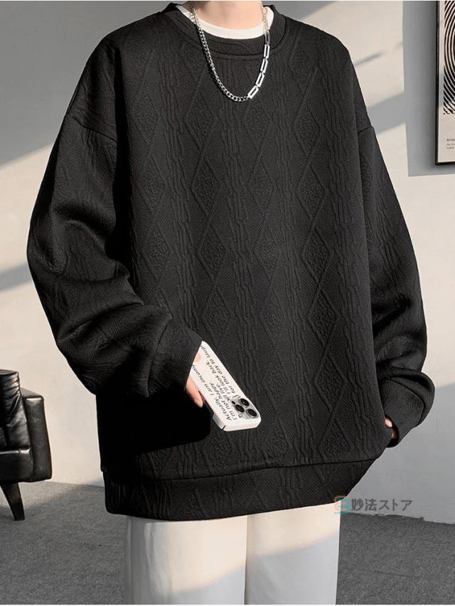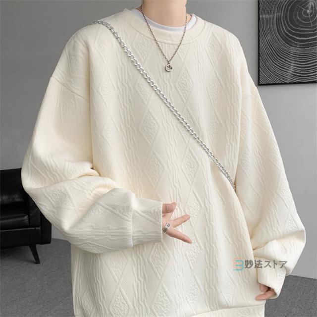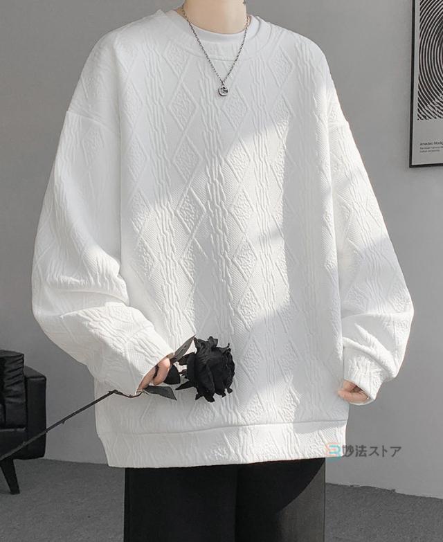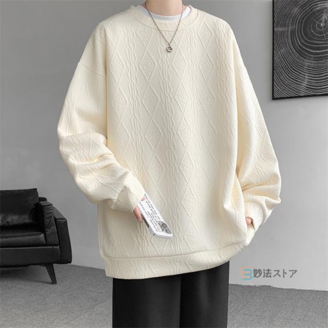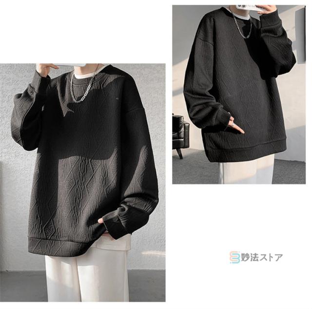 プルオーバー トレーナー メンズ ジャカード織 クルーネック トップス 長袖 凹凸感 大きいサイズ スウェット おしゃれ スエット ルームウェア 部屋着 カジュアル 黒 ブラック ホワイト 杏色 ユニセックス 秋 冬 秋冬