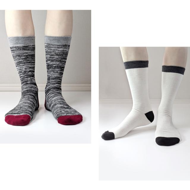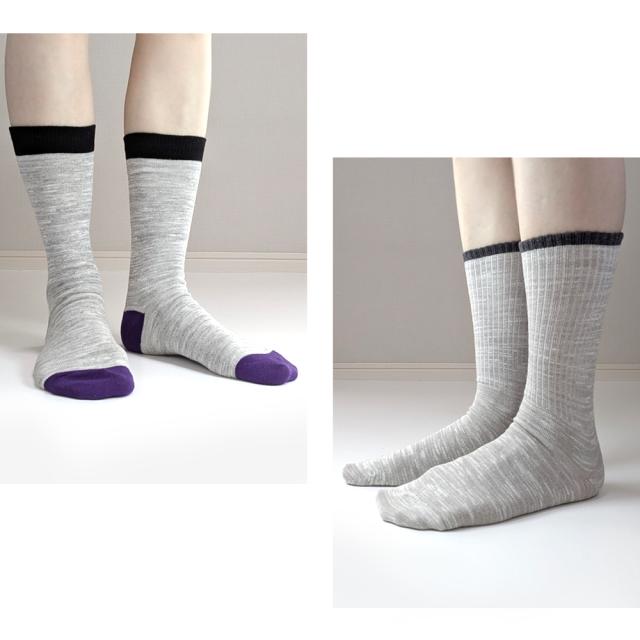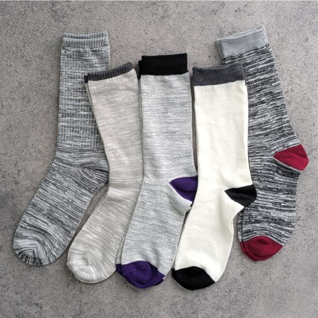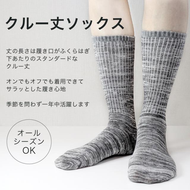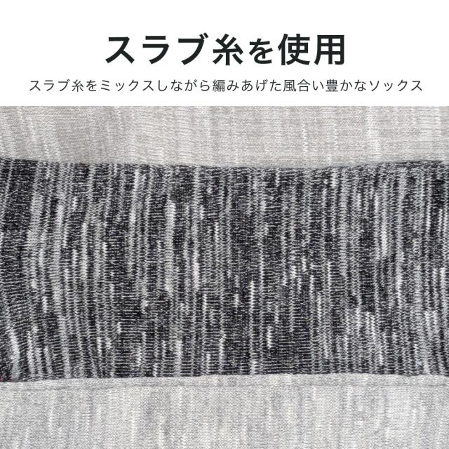 〇スラブ糸を使用した、ナチュラルな風合いと高い通気性が魅力のメンズクルー丈ソックス。