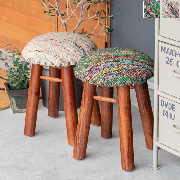 マンゴー材を使用した風合いのある太めの木脚と、カラフルな色合いのファブリックを組み合わせたアジアンテイストのスツールです。座面は肌ざわりの良い手織りのシルク&コットンの生地を使用。汗ばむ季節はベタつかず、冬場はヒヤッとしないので、オールシーズン快適にご使用いただけます。座面の周囲に打たれた鋲がさりげないアクセントに。脚の裏面には床の傷防止のパーツが付いています。背もたれがないから持ち運びも簡単!座面のカラーはマルチとベージュの2色からお選びいただけます。