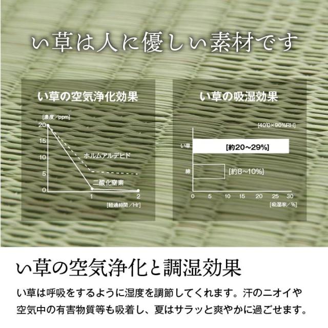 ■ い草には空気の清浄作用、湿度の調整作用があり、汚れにくいといった特徴があります。敷くだけで畳のお部屋をリフレッシュできます。