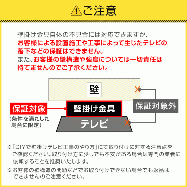テレビと金具の重量を支えられる強度の下地が入った(間柱や補強板)壁であればお取付可能です。