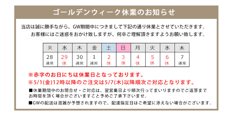 GW期間中は混雑が予想され、即日発送、ならびに配達日指定などご希望に添えない場合がございます。