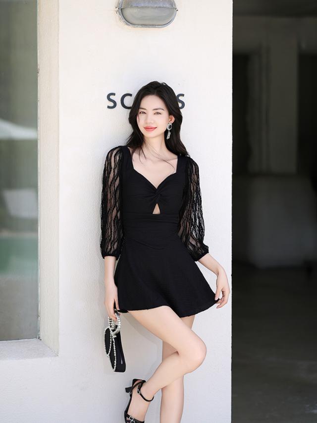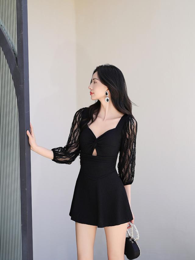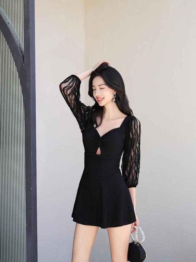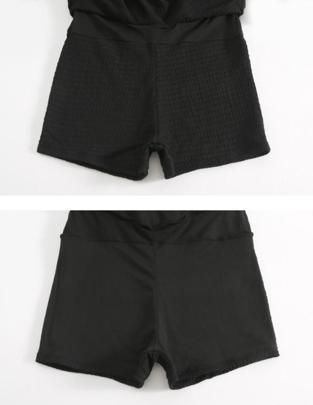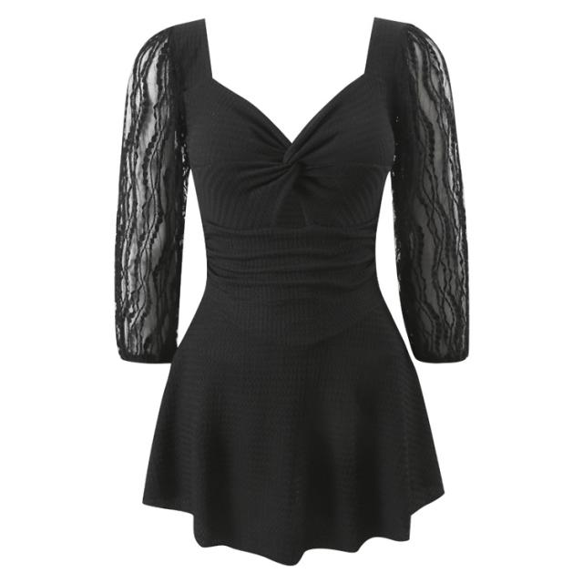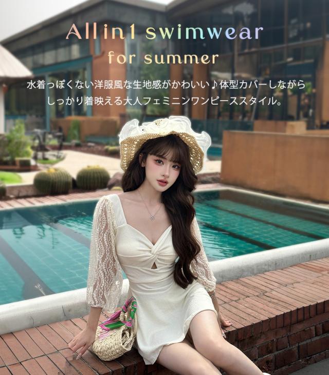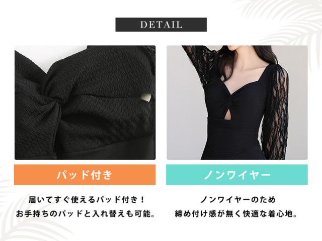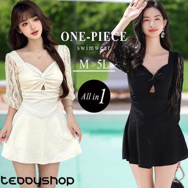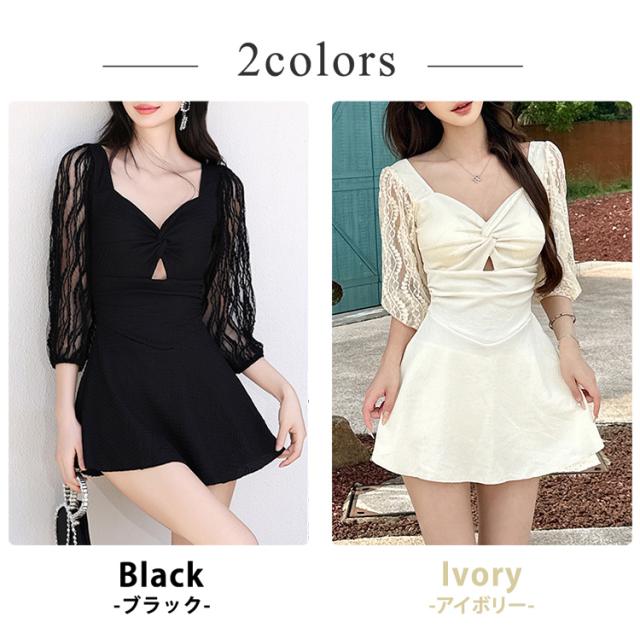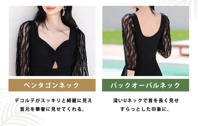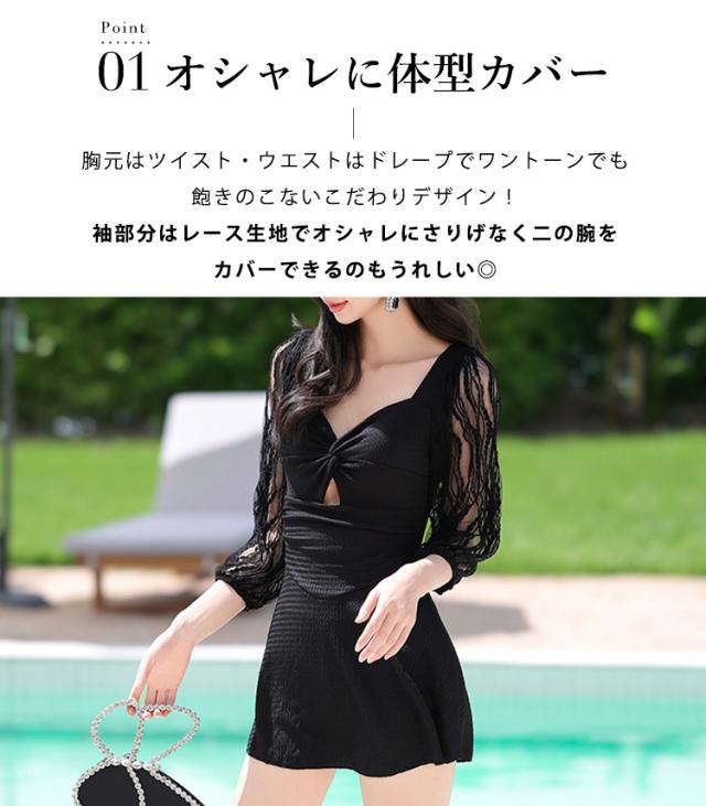 水着 ワンピース 体型カバー レディース 胸パッド付き オールインワン ペンタゴンネック 7分袖 シアー レース バックオーバルネック ノンワイヤー ウエスト切り替え ドレープ バスト 盛れる 二の腕 ウエスト ヒップ 太もも カバーアップ 黒