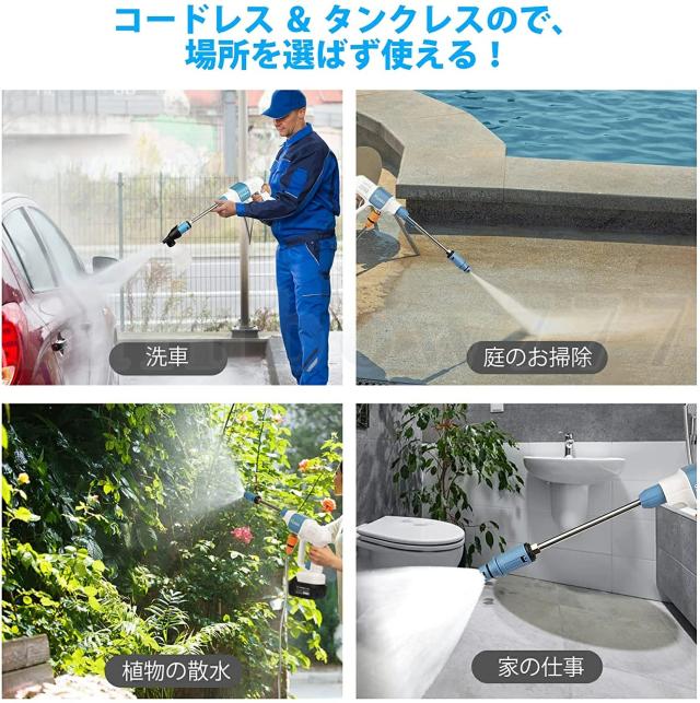 ポータブル充電式高圧洗浄は、庭の散水や植木の水やりにも使用できます。これは、家族と一緒に旅行するときに間違いなく役立ちます!マンションなどのベランダはもちろん、部屋掃除、外壁掃除やコケ落とし、車・自転車・バイクの洗車、アウトドア、キャンプ用品の清掃やBBQの片付けにも大活躍。