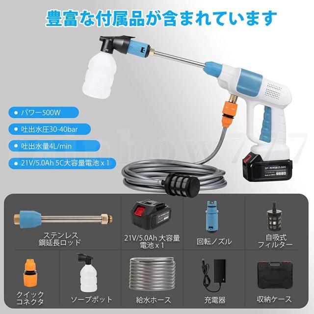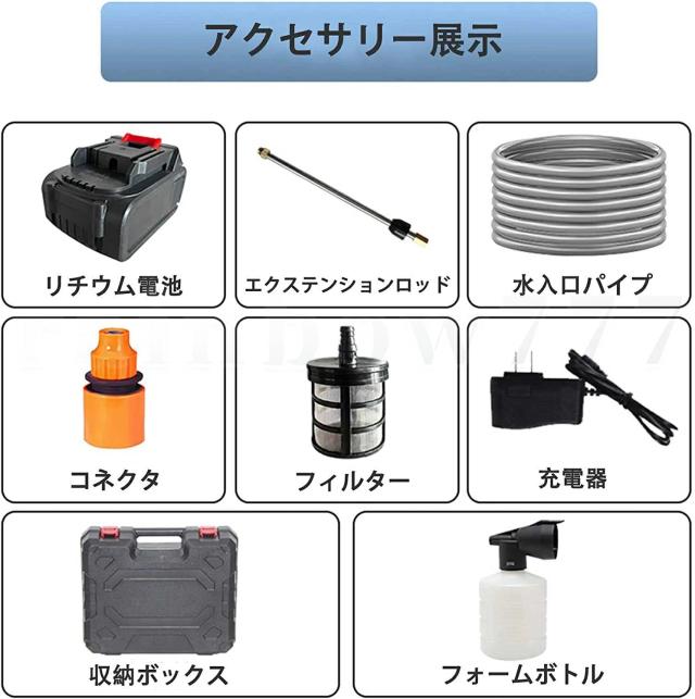 同梱内容:本体*1、バッテリー*1、回転ノズル*1、ステンレス綱延長ロッド*1、充電器*1、ソープボット*1、自吸式フィルター*1、収納ケース*1