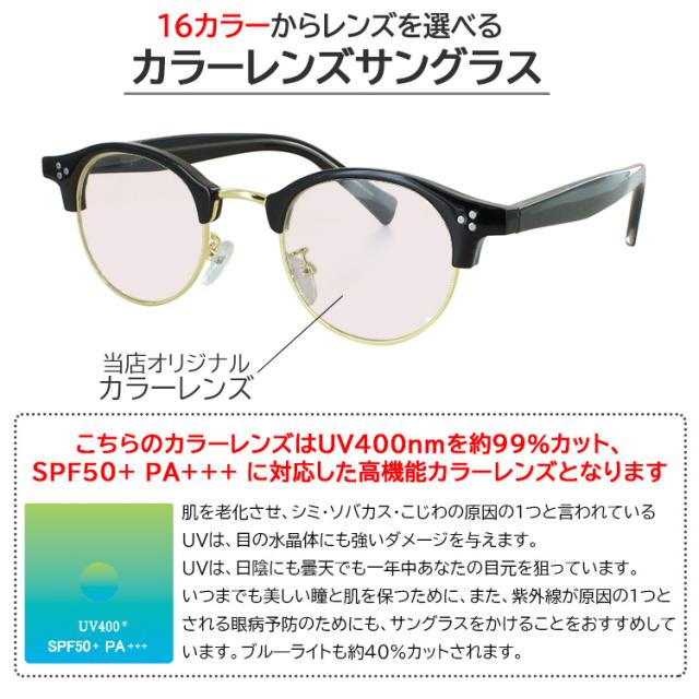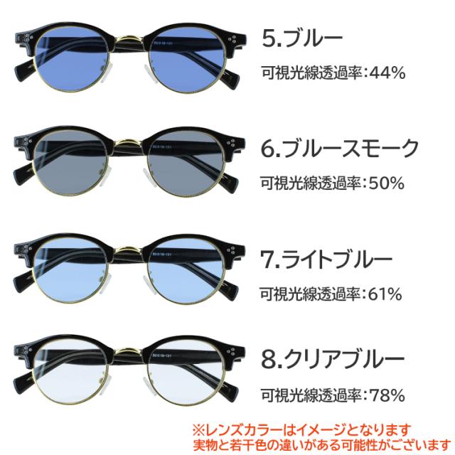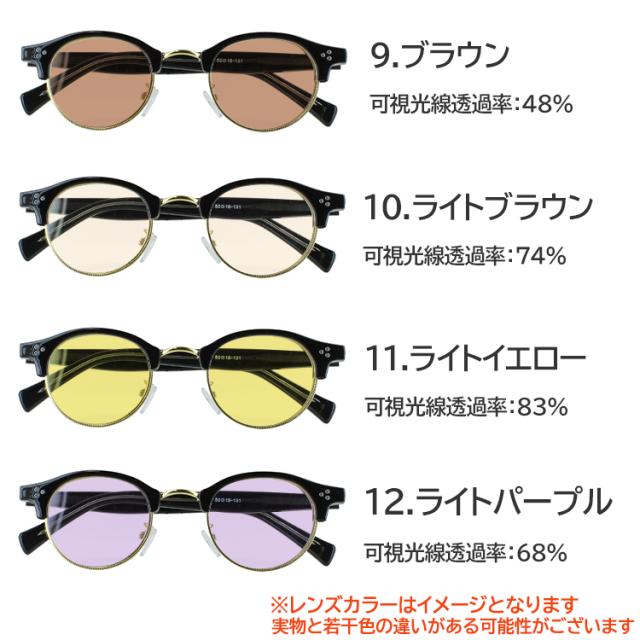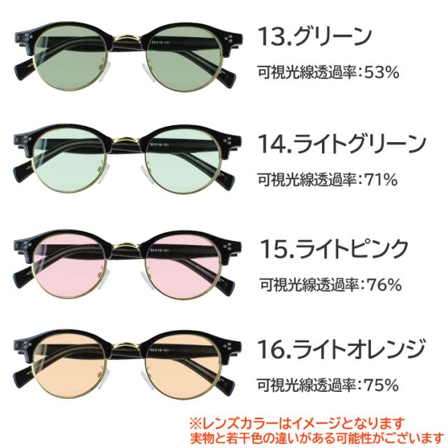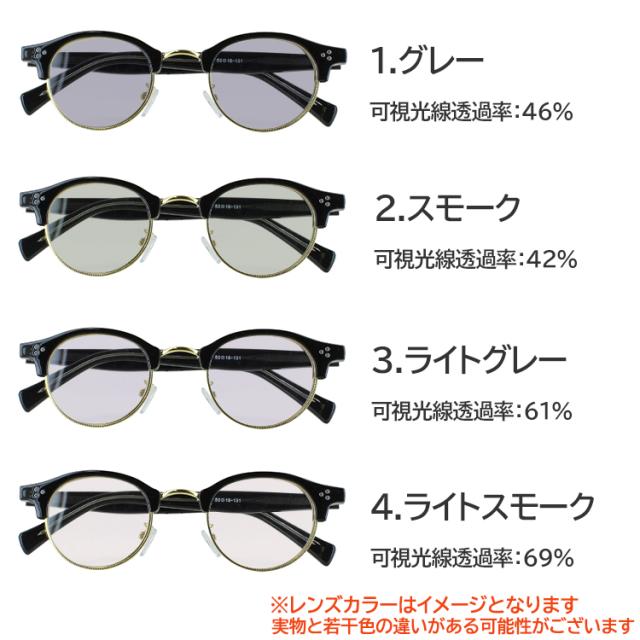 | 商品詳細 サーモントブロー ボストンタイプのメガネ フレームに、 カラーレンズを組み合わせた、サングラス メンズ レディース 男女兼用のユニセックスモデルです レトロでクラシックな雰囲気のおしゃれなメガネです こちらのカラーレンズはUV400nmを約99%カット、 SPF50+ PA+++に対応した高性能カラーレンズとなります ブルーライトも約40%カット レンズカラーは16色の中からお選びいただけます。 <レンズカラー:可視光線透過率 > 1.グレー:46% 2.スモーク:42% 3.ライトグレー:61% 4.ライトスモーク:69% 5.ブルー:44% 6.ブルースモーク:50% 7.ライトブルー:61% 8.クリアブルー:78% 9.ブラウン:48% 10.ライトブラウン:74% 11.ライトイエロー:83% 12.ライトパープル:68% 13.グリーン:53% 14.ライトグリーン:71% 15.ライトピンク:76% 16.ライトオレンジ:75% 薄い色のサングラスは、目元を隠すことなく、柔らかく自然な印象を与え、様々なシーンで活躍してくれます。 薄い色のサングラスの魅力 自然な視界: 濃い色に比べて視界が明るく、室内でも違和感なく着用できます。 軽やかな印象: 重厚感を与える濃い色とは対照的に、軽やかで爽やかな印象を与えます。 ファッション性の高さ: メガネのように気軽にコーディネートに取り入れられます。 | |