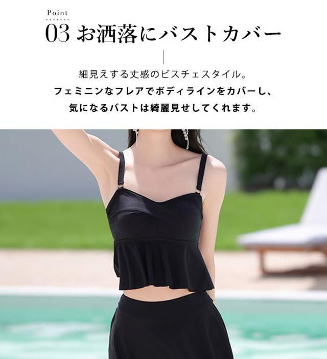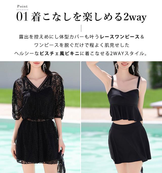 水着 体型カバー ビスチェ ビキニ レディース レース ワンピース 半袖 3点セット 大きいサイズ Vネック フレア ペプラム ノンワイヤー 一体型モールドカップ 二の腕 ウエスト ヒップ 太もも カバーアップ ぽっちゃり ママ 無地 黒 海 プール