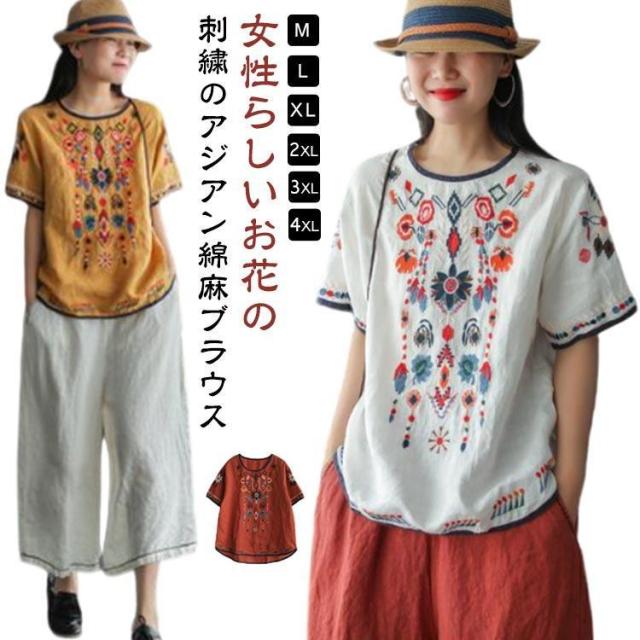 Tシャツ 半袖 涼しい 薄手 綿麻 プルオーバー リネン ナチュラル tシャツ アジアン 花 チュニック ブラウス ハーフ袖 涼しい エスニック クー