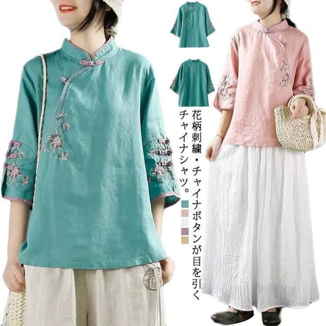リネンブラウス レディース 綿麻 リネン混 チャイナ風 花柄 刺繍 チャイナシャツ 薄手 七分袖 チャイナボタン 前開き トップス ブラウス プルオー