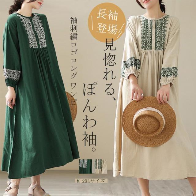 刺繍ワンピース 長袖 レディース ロングワンピース バルーン袖 ワンピース ロング 刺繍 エスニック マキシ マキシワンピース Aライン 体型カバー 春夏