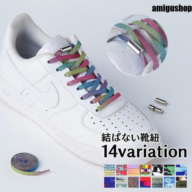 靴紐 結ばない靴ひも ほどけない くつ紐 平型 平紐 フラット 伸びる スニーカー用 シューレース ラメ キラキラ レインボー 迷彩 カモフラージュ柄