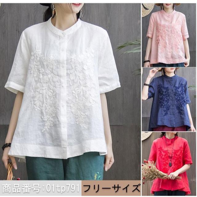 ブラウス レディース 春夏 リネン 刺繍 トップス チュニック 半袖 シャツブラウス 前開き 無地 体型カバー ゆったり 大きいサイズ お洒落 カジュアル トレロ