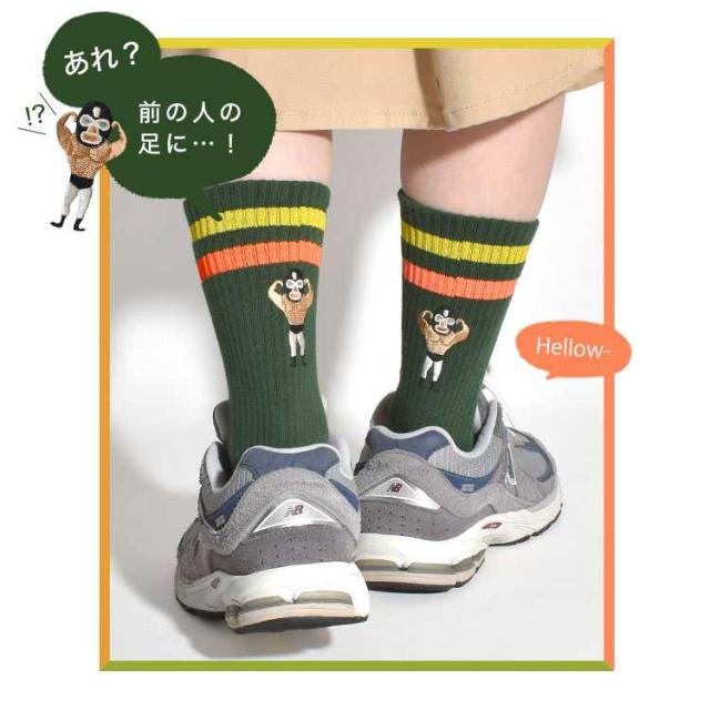 強そうに見えるかな、見えなくもないけれど。可笑しさがまさる覆面レスラーのファイティングポーズソックスが登場!抗菌防臭でいつでも爽やか!さらにライン部分には光に反射する糸を使ってるから、ライトに照らすとキラッと光っておしゃれ♪サイズは23-25cm(レディース)と25-27cm(メンズ)で、友達とおそろいにも◎カラフルなボーダー柄がアクセントになって、フェスやアウトドアイベントにぴったり!ギフトにも喜ばれるアイテムです☆