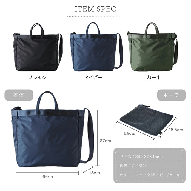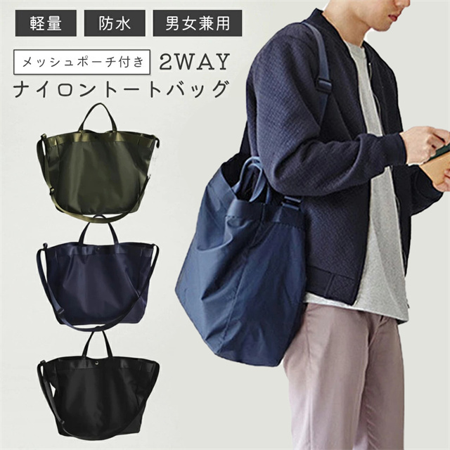 ショルダーとハンドバッグの2WAYで使用可能なナイロンバッグ。 軽量なナイロン製で通勤や通学に最適! シンプルなデザインで男女兼用でご使用いただけます。 メッシュ素材のポーチも付属しているので普段使いはもちろん旅行にも最適です◎ |