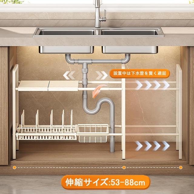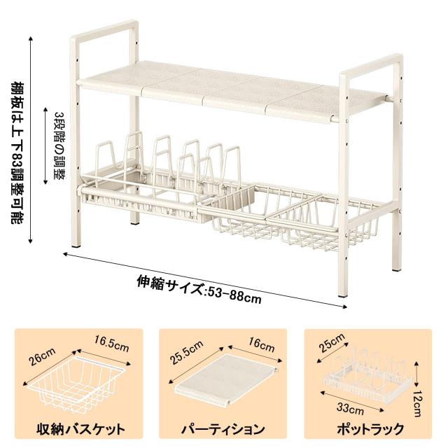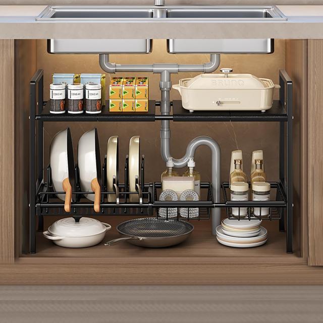 キッチンシンク下収納, 洗面台下収納 キッチン収納ラック 伸縮式, 2段収納 キッチン収納ラック 組み立て簡単 省スペース 収納バスケット2個付き, (仕切り4枚+バスケット2個+ポットホルダー1個)(ブラック)
