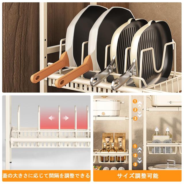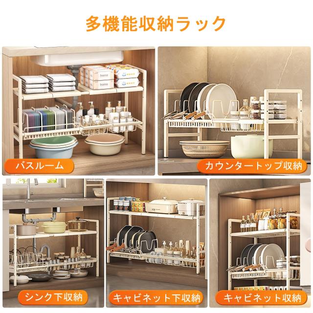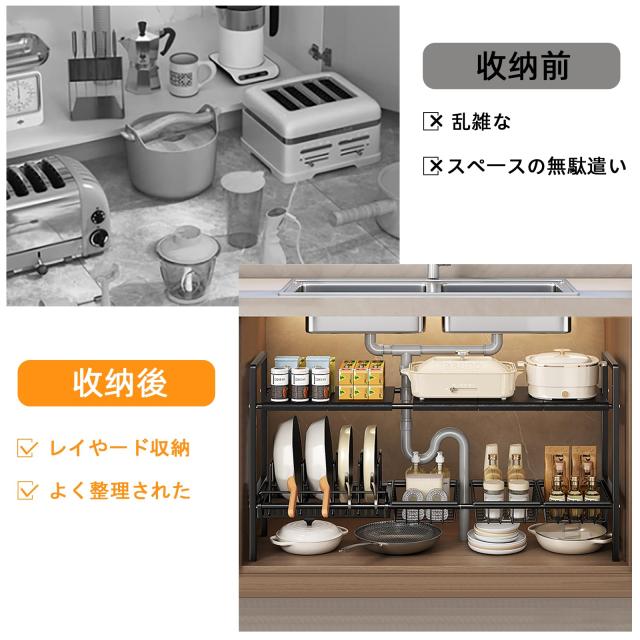 シンク下収納ラック, 洗面台下収納 キッチン収納ラック 洗面台下収納 キッチン収納ラック 伸縮式, 2段収納 キッチン収納ラック 組み立て簡単 省スペース 収納バスケット3個付き (仕切り5枚+バスケット3個+ポットホルダー1個)(ブラック)