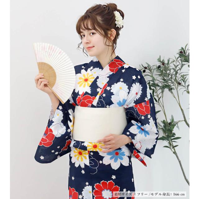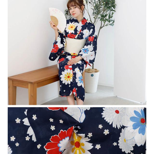 浴衣「夜空舞う花々」は、濃紺の夜空に映える大輪の花々をちりばめた華やかなデザインが魅力。