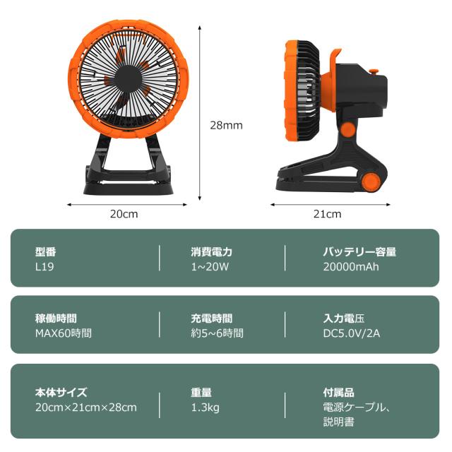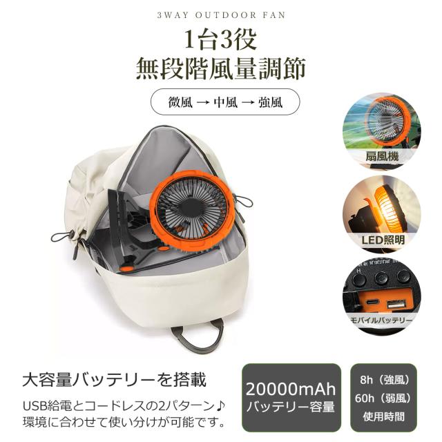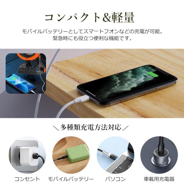 - 20000mAh大容量バッテリー搭載で、1回充電で最大60時間連続使用可能です。外出や停電時でも安心使えます。給電方法はUSB給電とコードレスの2パターンがあり、環境に合わせて使い分けられます。スマホの電池残量が少なくなった場合、扇風機をモバイルバッテリーとして活用することができ、大変便利です。