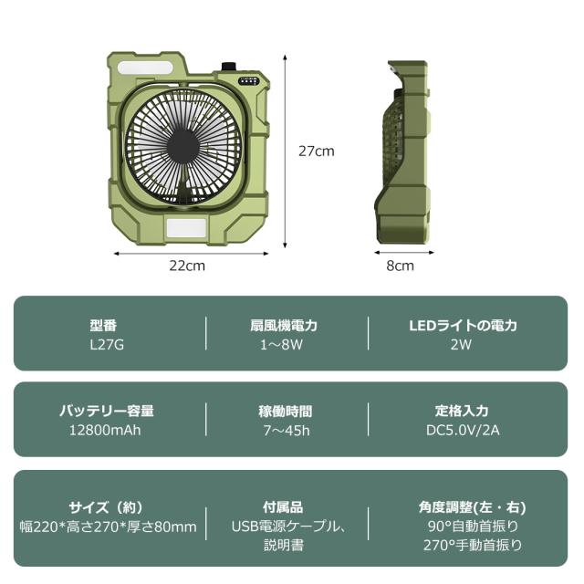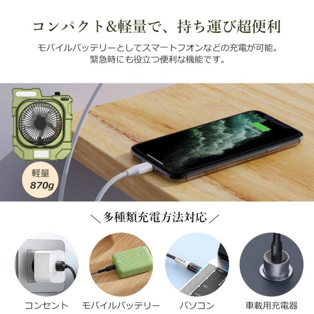 - 本扇風機は12800mAh大容量バッテリー搭載で、1回充電で最大45時間連続使用可能です。外出や停電時でも安心使えます。給電方法はUSB給電とコードレスの2パターンがあり、環境に合わせて使い分けられます。スマホの電池残量が少なくなった場合、扇風機をモバイルバッテリーとして活用することができ、大変便利です。