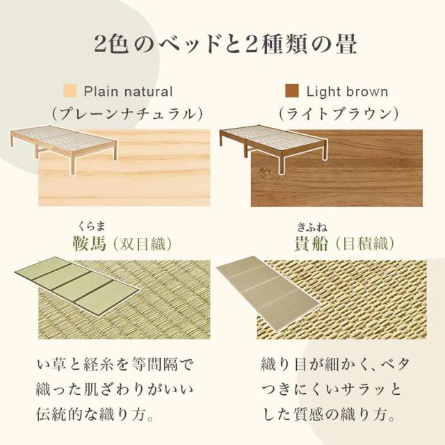 和室・洋室どちらのお部屋にも自然に溶け込むデザインで、2色のベッドフレームと2種類の畳からお選びいただけます。