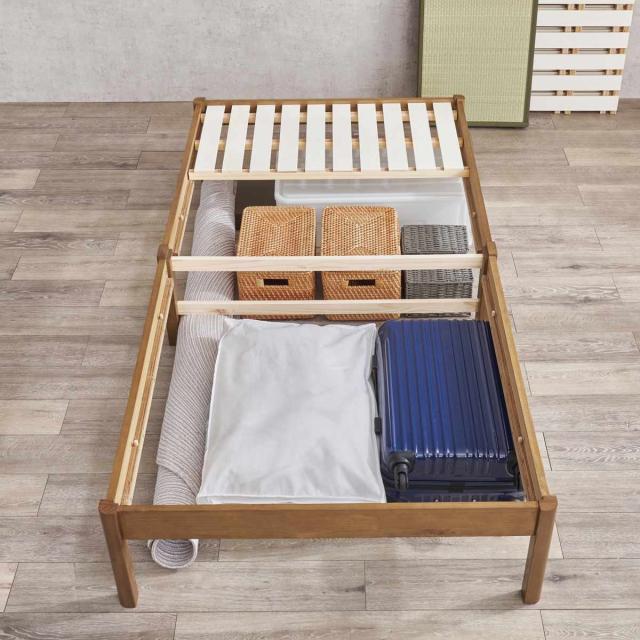 ベッド下は収納スペースとしてお使いいただけます。収納ケースの他、キャリーバッグやラグ、布団や季節用品など、かさばるものや使用頻度の低い物の収納にもぴったりです。