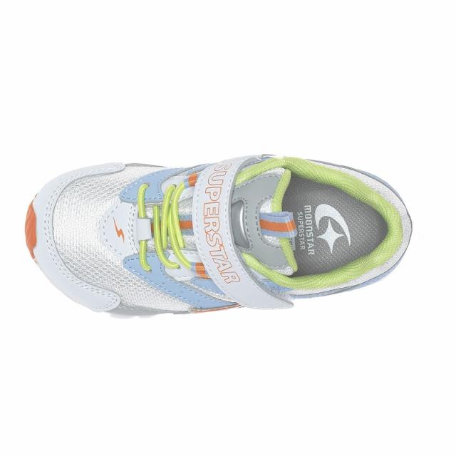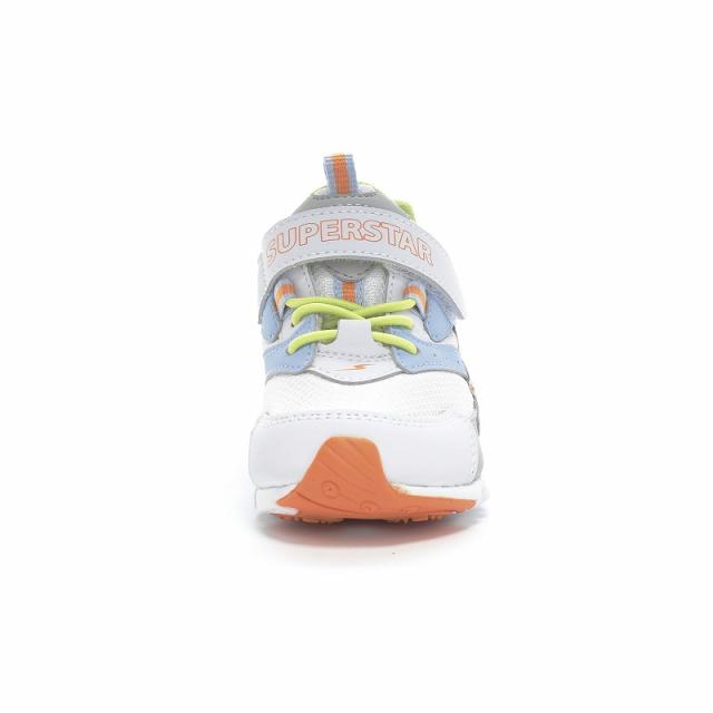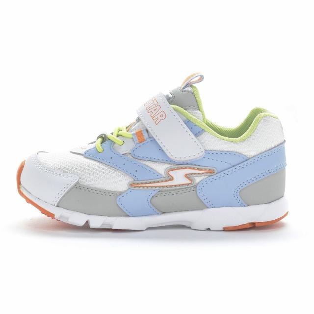 子どもたちの「速く走りたい」という想いから生まれた「スーパースター」のキッズシューズです。「速く走る」を体現するために搭載されたパワーバネが走りをアシストします。脱ぎ履きしやすいゴム紐×バンドタイプです。2001年に誕生した初代SUPERSTARの雰囲気を踏襲したデザインの商品です。初代をデザインソースとしつつ、今っぽさもある雰囲気で服装にも合わせやすい商品デザインです。兄弟姉妹でのリンク着用にもおすすめです。お出かけはもちろん、運動会や体育の時間等の走るシーンにもおすすめです。重さは17.0cmで片足約110gです。【パワーバネ】ムーンスター独自開発の特殊なゴムを靴底に搭載し、地面を踏みこむときにパワーを蓄積し、蹴り出すと同時に一気にパワーを推進力に。【カウンターボックス】子どもの柔らかくゆがみやすい足を箱型構造でしっかり支えます。【Ag+抗菌防臭】銀イオンの抗菌作用でにおいのもととなる菌の増殖を抑制し、防臭効果を発揮します。【洗えるインソール】インソールは取り出して洗えるのでいつも清潔に保てます。【サラリーナ】汗や水分を素早く吸収・拡散し、靴内をサラサラな状態に保つメッシュを採用しています・・・