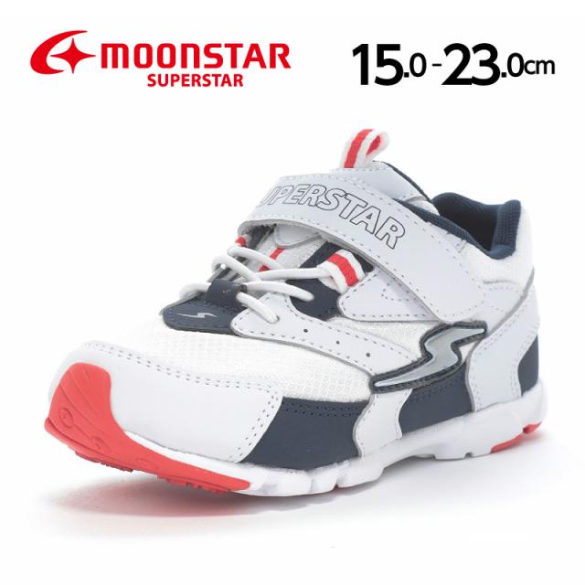 子どもたちの「速く走りたい」という想いから生まれた「スーパースター」のキッズシューズです。「速く走る」を体現するために搭載されたパワーバネが走りをアシストします。脱ぎ履きしやすいゴム紐×バンドタイプです。2001年に誕生した初代SUPERSTARの雰囲気を踏襲したデザインの商品です。初代をデザインソースとしつつ、今っぽさもある雰囲気で服装にも合わせやすい商品デザインです。兄弟姉妹でのリンク着用にもおすすめです。お出かけはもちろん、運動会や体育の時間等の走るシーンにもおすすめです。重さは17.0cmで片足約110gです。【パワーバネ】ムーンスター独自開発の特殊なゴムを靴底に搭載し、地面を踏みこむときにパワーを蓄積し、蹴り出すと同時に一気にパワーを推進力に。【カウンターボックス】子どもの柔らかくゆがみやすい足を箱型構造でしっかり支えます。【Ag+抗菌防臭】銀イオンの抗菌作用でにおいのもととなる菌の増殖を抑制し、防臭効果を発揮します。【洗えるインソール】インソールは取り出して洗えるのでいつも清潔に保てます。【サラリーナ】汗や水分を素早く吸収・拡散し、靴内をサラサラな状態に保つメッシュを採用しています・・・