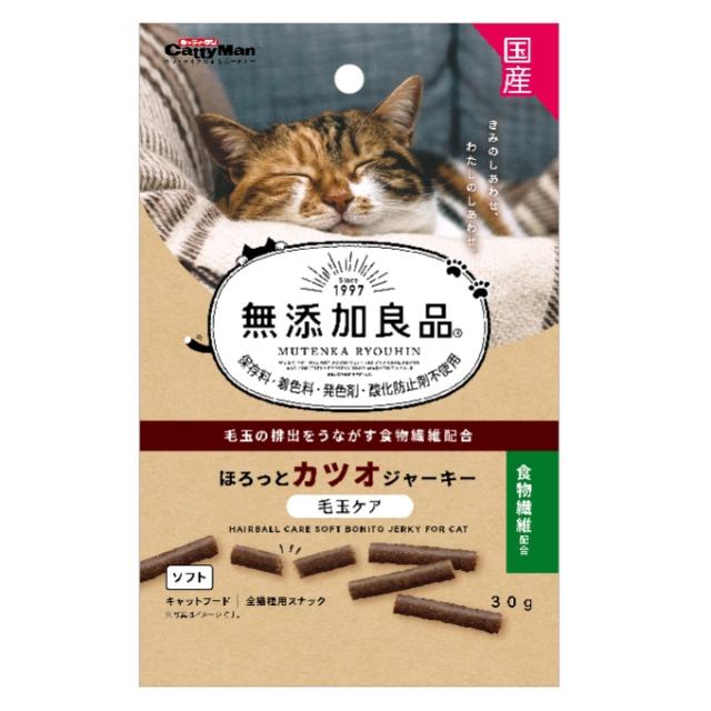 気になる添加物は使わない、おいしい素材感。毛玉の排出をうながす食物繊維配合。 ・ほろっとやわらか食感のカツオ入りジャーキー。 ・食欲をそそるカツオの旨みが濃く香る。毛玉の排出をうながす食物繊維入り。 ・大切な家族だから“気になる添加物”は使わない、加えない。それがドギーマンの《無添加良品》シリーズです。 ・2ヶ月未満の幼猫には与えないでください。 4976555826470