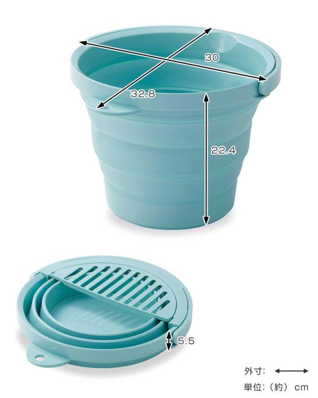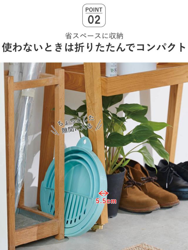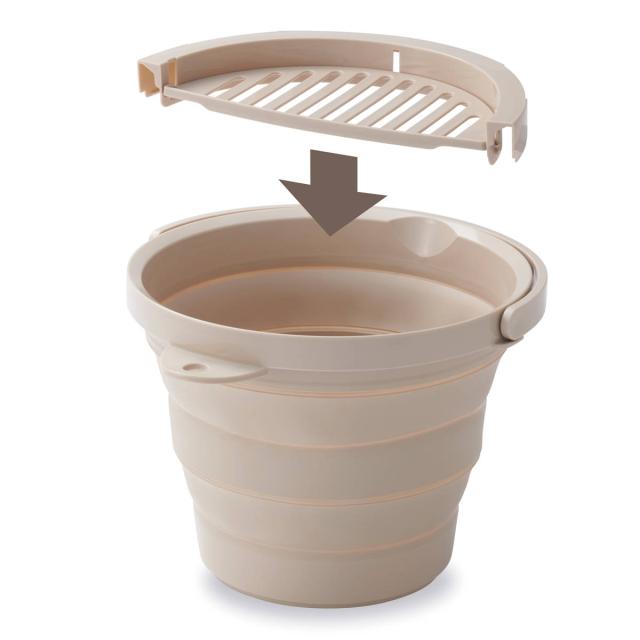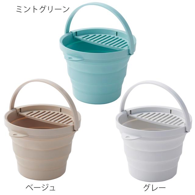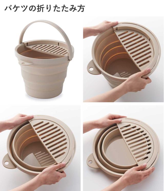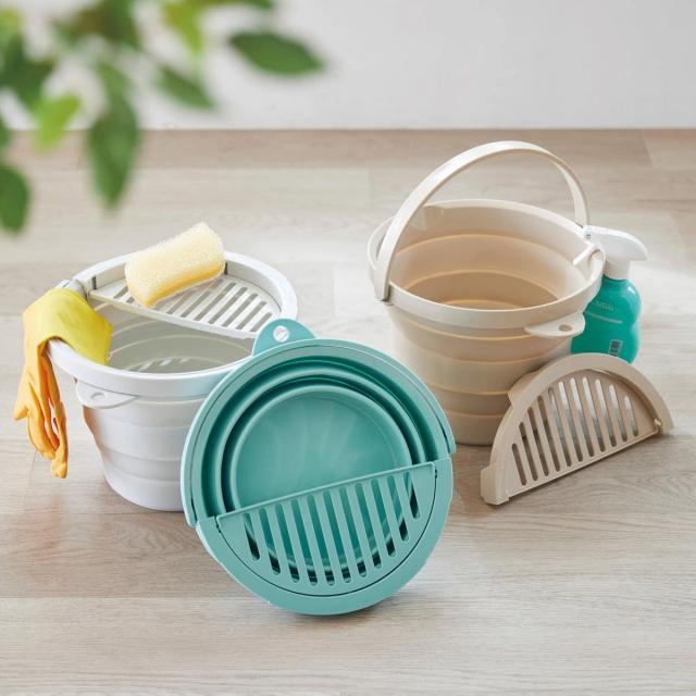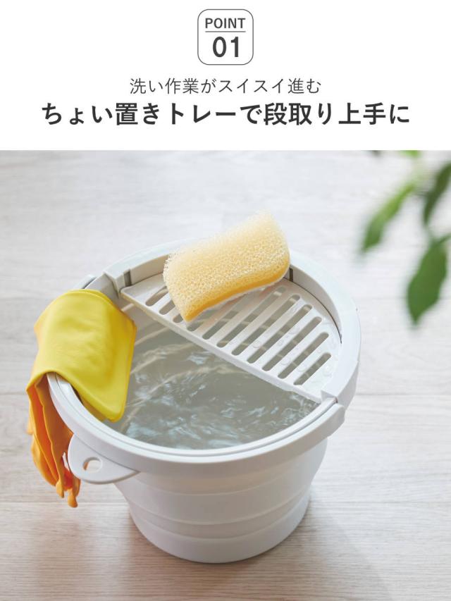 手洗いやつけ置き洗いに便利な折りたためるソフトバケツです。取り外し可能な「ちょい置きトレー」付きで、洗剤やブラシを置いたり、洗ったものの一時置きに大活躍します。