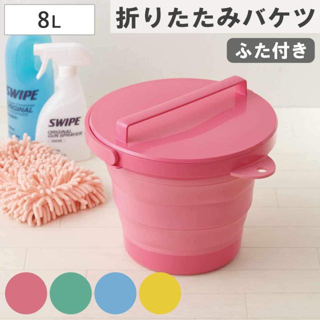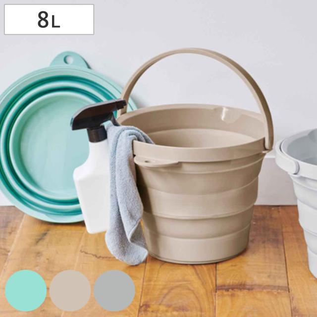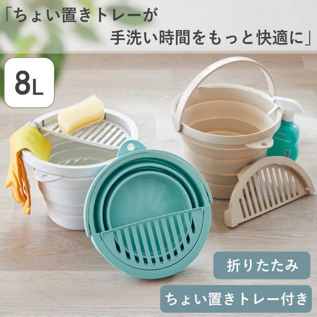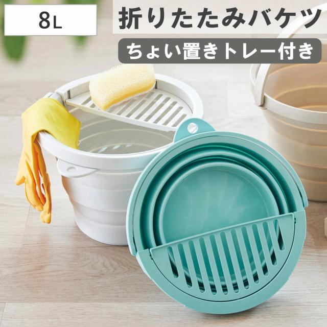 バケツ 折りたたみ 8L ちょい置きトレー付 ソフトバケツ ( 折りたたみバケツ 8リットル たためる 丸型 掃除 漬け置き トレー 水切り 日本製 吊り下げ収納 清掃 おりたたみ コンパクト スリム 洗濯 )