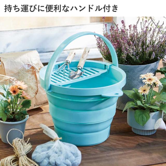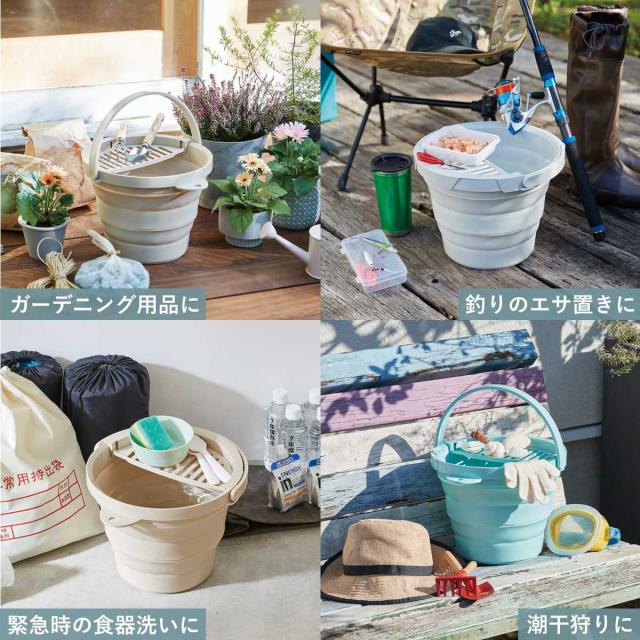 窓拭きや小物洗いなどのちょっとした家事はもちろん、水辺や砂浜では遊び道具入れとして、ガーデニングでは散らかりやすい道具をまとめる収納としても便利。もしもの時には防災用バケツとしても頼れる存在です。丈夫で柔らかい素材だから扱いやすく、毎日の「助かった」を増やしてくれる心強いマルチバケツです。