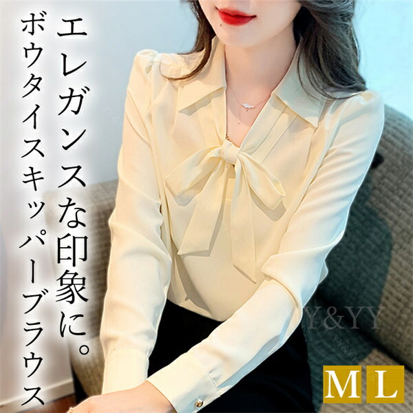 ブラウス 長袖 かわいい レディース トップス tops ボウタイ スキッパーリボン 無地 コンパクト シンプル インナー デイリー オフィス 春 夏 秋 韓国ファッション カットソー 大人 M L Uネック Vネック ベーシック レース