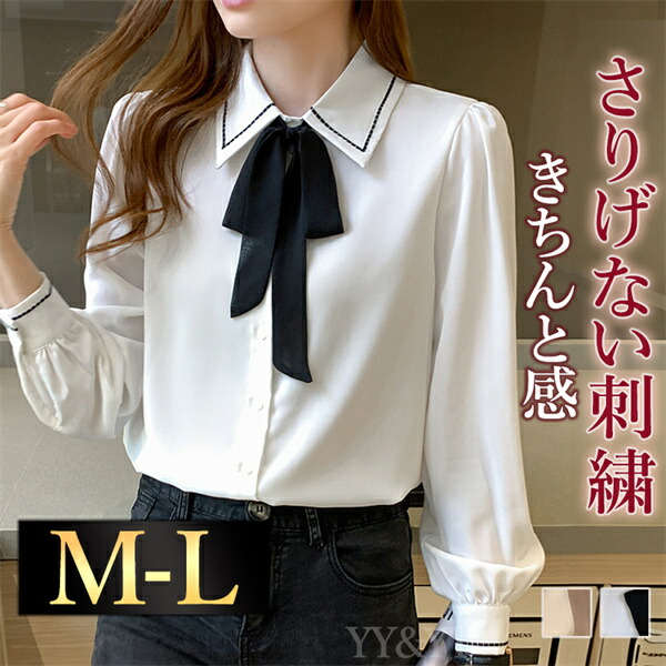 シャツ トップス ブラウス オフィス かわいい レディース リボン タイ 大人 シャツ 長袖 シンプル デイリー 春 秋 韓国ファッション M L ホワイト ベージュ ベーシック ナチュラル きれいめ オフィスカジュアル イエベ しろ ブルベ 無地 30代