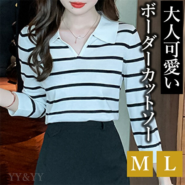 トップス カットソー ニット 長袖 かわいい レディース tops ボーダー 無地 コンパクト シンプル インナー デイリー オフィス 春 夏 秋 韓国ファッション カットソー 大人 M L Vネック ベーシック レース ボーダー OL 通勤