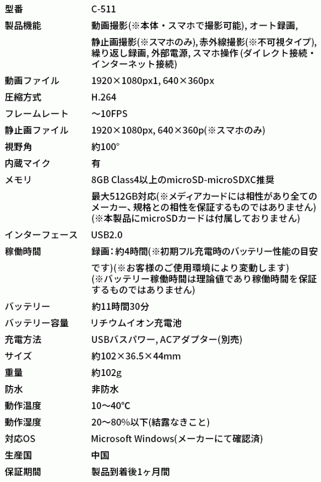 ・本製品は映像録画をメインとしたもので、音声につきましては、音ズレ、音量の変化、ノイズが生じます。また、専用アプリによる録画の音声につきましても、同様の症状がみられます。予めご了承ください。