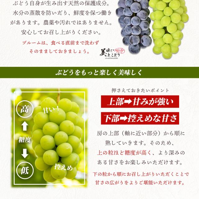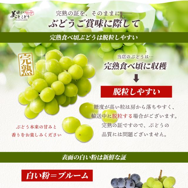 糖度が高くなるにつれ房から実が外れやすくなりますがご了承ください。生ものですので、お受け取り後はすぐに状態を確認し、適切に保存の上、できるだけ早めにお召し上がりください。