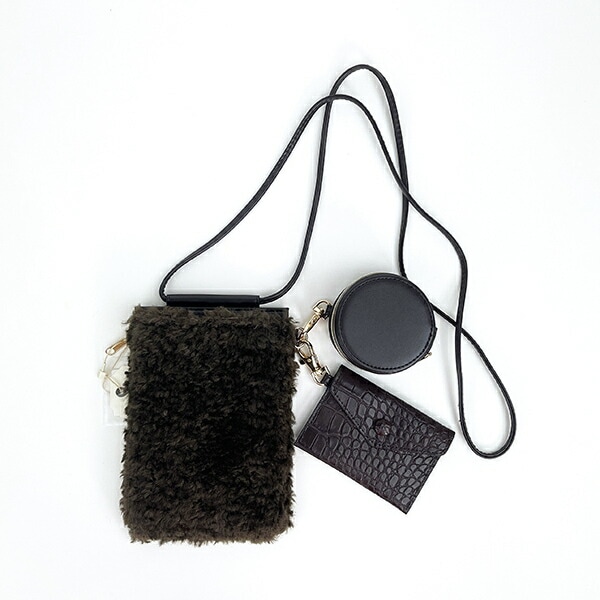 モコモコのボア×合皮×クロコ柄の組み合わせがかわいいモバイルショルダーバッグです。ポーチは着脱可能なので外しての使用も可能です!ポーチ2種はコインケースやイヤフォン入れにも◎シンプルになりがちな秋冬のコーディネートのアクセントになっちゃいます♪【サイズ:ポーチ(サークル):7cm×7cm×3.5cm、ポーチ(カードケース):7.5cm×10cm、持ち手:17cm、ショルダー:MAX110cm】