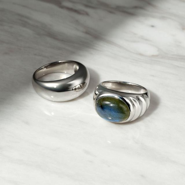 シルバーカラーの大ぶりなリングはコーディネートの主役にもなり、柔らかい色合いの光で手元を美しく彩ります。